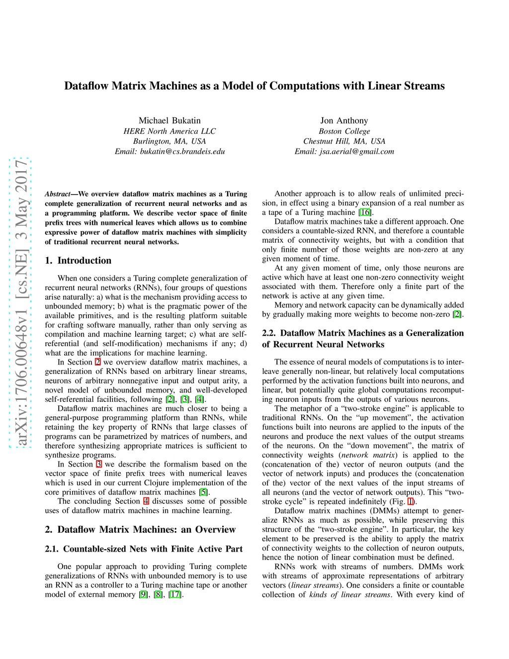 We overview dataflow matrix machines as a Turing complete generalization of recurrent neural networks and as a programming platform. We describe vector space of finite prefix trees with numerical leaves which allows us to combine expressive power of dataflow matrix machines with simplicity of traditional recurrent neural networks.