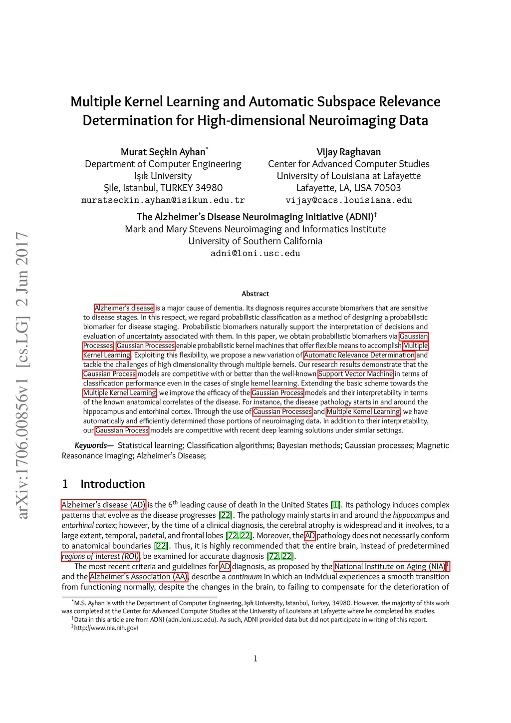 Alzheimer's disease is a major cause of dementia. Its diagnosis requires accurate biomarkers that are sensitive to disease stages. In this respect, we regard probabilistic classification as a method of designing a probabilistic biomarker for disease staging. Probabilistic biomarkers naturally support the interpretation of decisions and evaluation of uncertainty associated with them. In this paper, we obtain probabilistic biomarkers via Gaussian Processes. Gaussian Processes enable probabilistic kernel machines that offer flexible means to accomplish Multiple Kernel Learning. Exploiting this flexibility, we propose a new variation of Automatic Relevance Determination and tackle the challenges of high dimensionality through multiple kernels. Our research results demonstrate that the Gaussian Process models are competitive with or better than the well-known Support Vector Machine in terms of classification performance even in the cases of single kernel learning. Extending the basic scheme towards the Multiple Kernel Learning, we improve the efficacy of the Gaussian Process models and their interpretability in terms of the known anatomical correlates of the disease. For instance, the disease pathology starts in and around the hippocampus and entorhinal cortex. Through the use of Gaussian Processes and Multiple Kernel Learning, we have automatically and efficiently determined those portions of neuroimaging data. In addition to their interpretability, our Gaussian Process models are competitive with recent deep learning solutions under similar settings.