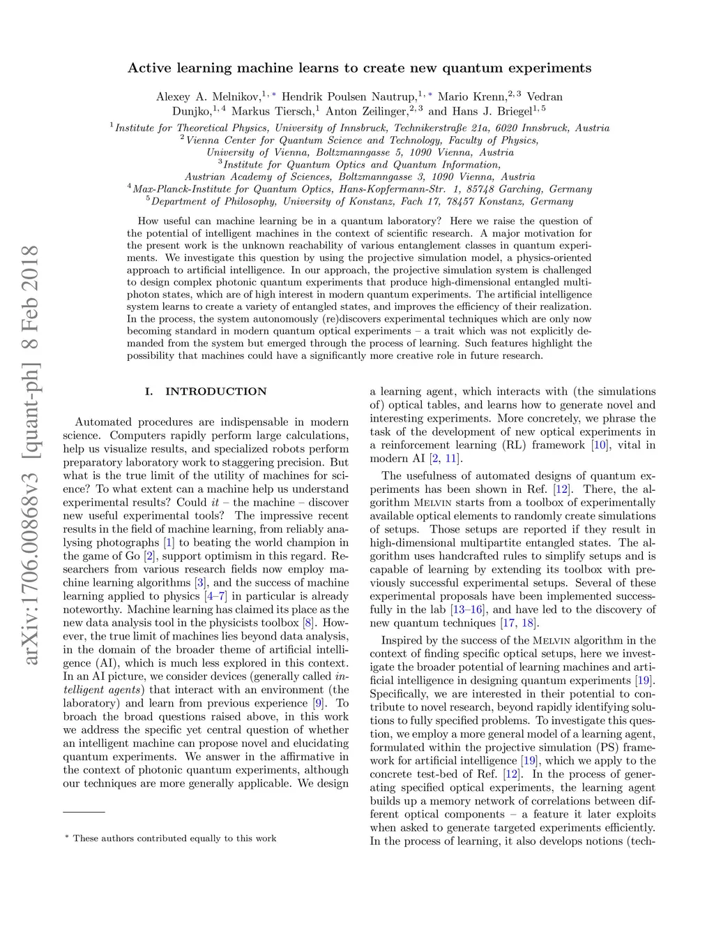 How useful can machine learning be in a quantum laboratory? Here we raise the question of the potential of intelligent machines in the context of scientific research. A major motivation for the present work is the unknown reachability of various entanglement classes in quantum experiments. We investigate this question by using the projective simulation model, a physics-oriented approach to artificial intelligence. In our approach, the projective simulation system is challenged to design complex photonic quantum experiments that produce high-dimensional entangled multiphoton states, which are of high interest in modern quantum experiments. The artificial intelligence system learns to create a variety of entangled states, and improves the efficiency of their realization. In the process, the system autonomously (re)discovers experimental techniques which are only now becoming standard in modern quantum optical experiments - a trait which was not explicitly demanded from the system but emerged through the process of learning. Such features highlight the possibility that machines could have a significantly more creative role in future research.