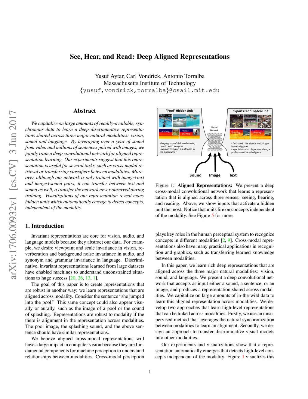 We capitalize on large amounts of readily-available, synchronous data to learn a deep discriminative representations shared across three major natural modalities: vision, sound and language. By leveraging over a year of sound from video and millions of sentences paired with images, we jointly train a deep convolutional network for aligned representation learning. Our experiments suggest that this representation is useful for several tasks, such as cross-modal retrieval or transferring classifiers between modalities. Moreover, although our network is only trained with image+text and image+sound pairs, it can transfer between text and sound as well, a transfer the network never observed during training. Visualizations of our representation reveal many hidden units which automatically emerge to detect concepts, independent of the modality.