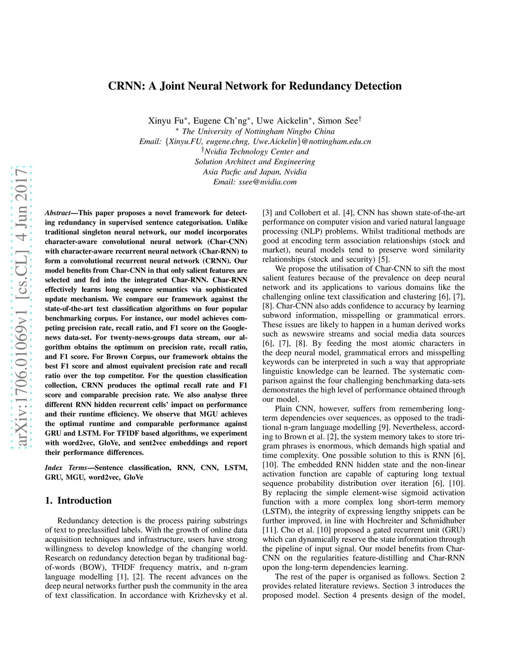 This paper proposes a novel framework for detecting redundancy in supervised sentence categorisation. Unlike traditional singleton neural network, our model incorporates character-aware convolutional neural network (Char-CNN) with character-aware recurrent neural network (Char-RNN) to form a convolutional recurrent neural network (CRNN). Our model benefits from Char-CNN in that only salient features are selected and fed into the integrated Char-RNN. Char-RNN effectively learns long sequence semantics via sophisticated update mechanism. We compare our framework against the state-of-the-art text classification algorithms on four popular benchmarking corpus. For instance, our model achieves competing precision rate, recall ratio, and F1 score on the Google-news data-set. For twenty-news-groups data stream, our algorithm obtains the optimum on precision rate, recall ratio, and F1 score. For Brown Corpus, our framework obtains the best F1 score and almost equivalent precision rate and recall ratio over the top competitor. For the question classification collection, CRNN produces the optimal recall rate and F1 score and comparable precision rate. We also analyse three different RNN hidden recurrent cells' impact on performance and their runtime efficiency. We observe that MGU achieves the optimal runtime and comparable performance against GRU and LSTM. For TFIDF based algorithms, we experiment with word2vec, GloVe, and sent2vec embeddings and report their performance differences.