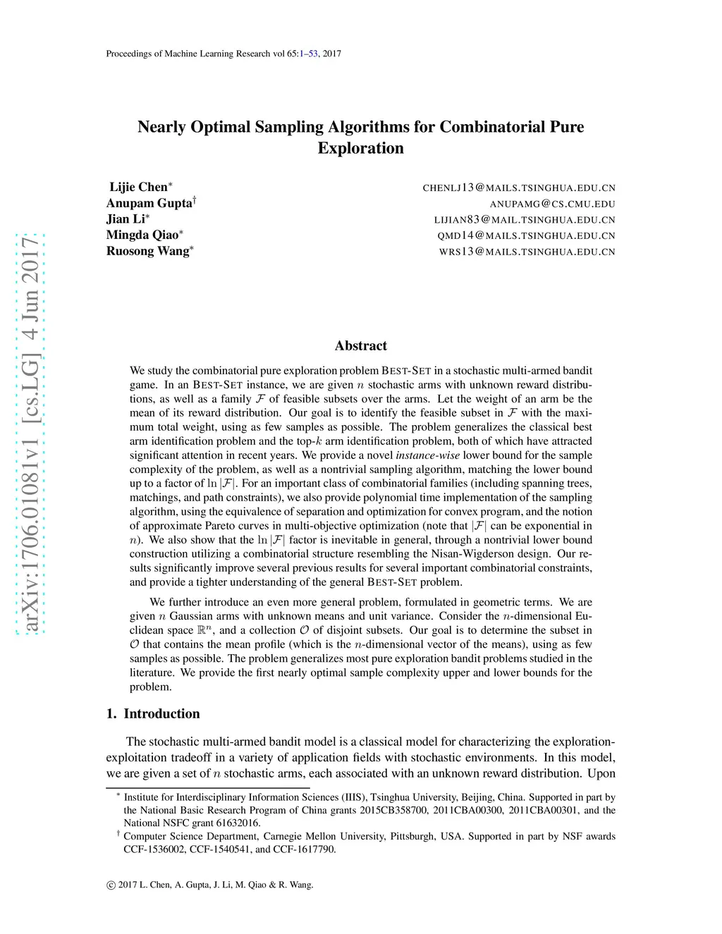 We study the combinatorial pure exploration problem Best-Set in stochastic multi-armed bandits. In a Best-Set instance, we are given arms with unknown reward distributions, as well as a family of feasible subsets over the arms. Our goal is to identify the feasible subset in with the maximum total mean using as few samples as possible. The problem generalizes the classical best arm identification problem and the top- arm identification problem, both of which have attracted significant attention in recent years. We provide a novel instance-wise lower bound for the sample complexity of the problem, as well as a nontrivial sampling algorithm, matching the lower bound up to a factor of . For an important class of combinatorial families, we also provide polynomial time implementation of the sampling algorithm, using the equivalence of separation and optimization for convex program, and approximate Pareto curves in multi-objective optimization. We also show that the factor is inevitable in general through a nontrivial lower bound construction. Our results significantly improve several previous results for several important combinatorial constraints, and provide a tighter understanding of the general Best-Set problem. We further introduce an even more general problem, formulated in geometric terms. We are given Gaussian arms with unknown means and unit variance. Consider the -dimensional Euclidean space , and a collection of disjoint subsets. Our goal is to determine the subset in that contains the -dimensional vector of the means. The problem generalizes most pure exploration bandit problems studied in the literature. We provide the first nearly optimal sample complexity upper and lower bounds for the problem.