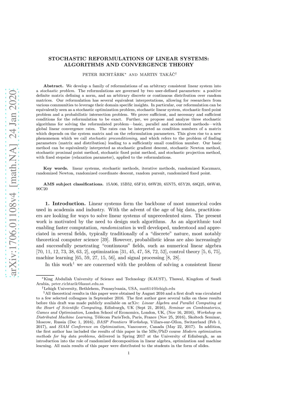 We develop a family of reformulations of an arbitrary consistent linear system into a stochastic problem. The reformulations are governed by two user-defined parameters: a positive definite matrix defining a norm, and an arbitrary discrete or continuous distribution over random matrices. Our reformulation has several equivalent interpretations, allowing for researchers from various communities to leverage their domain specific insights. In particular, our reformulation can be equivalently seen as a stochastic optimization problem, stochastic linear system, stochastic fixed point problem and a probabilistic intersection problem. We prove sufficient, and necessary and sufficient conditions for the reformulation to be exact. Further, we propose and analyze three stochastic algorithms for solving the reformulated problem---basic, parallel and accelerated methods---with global linear convergence rates. The rates can be interpreted as condition numbers of a matrix which depends on the system matrix and on the reformulation parameters. This gives rise to a new phenomenon which we call stochastic preconditioning, and which refers to the problem of finding parameters (matrix and distribution) leading to a sufficiently small condition number. Our basic method can be equivalently interpreted as stochastic gradient descent, stochastic Newton method, stochastic proximal point method, stochastic fixed point method, and stochastic projection method, with fixed stepsize (relaxation parameter), applied to the reformulations.