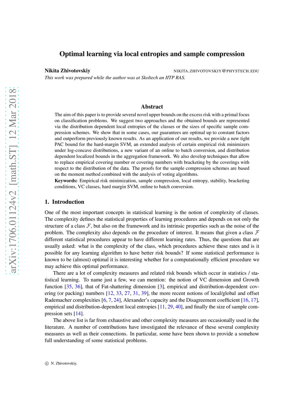 Optimal learning via local entropies and sample compression