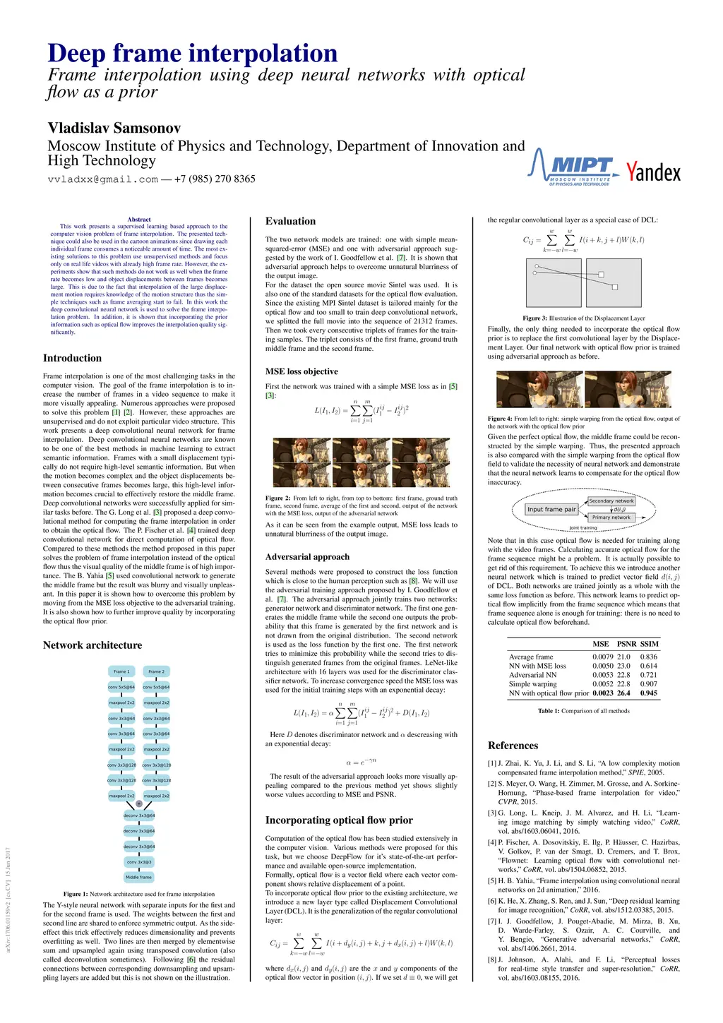 This work presents a supervised learning based approach to the computer vision problem of frame interpolation. The presented technique could also be used in the cartoon animations since drawing each individual frame consumes a noticeable amount of time. The most existing solutions to this problem use unsupervised methods and focus only on real life videos with already high frame rate. However, the experiments show that such methods do not work as well when the frame rate becomes low and object displacements between frames becomes large. This is due to the fact that interpolation of the large displacement motion requires knowledge of the motion structure thus the simple techniques such as frame averaging start to fail. In this work the deep convolutional neural network is used to solve the frame interpolation problem. In addition, it is shown that incorporating the prior information such as optical flow improves the interpolation quality significantly.