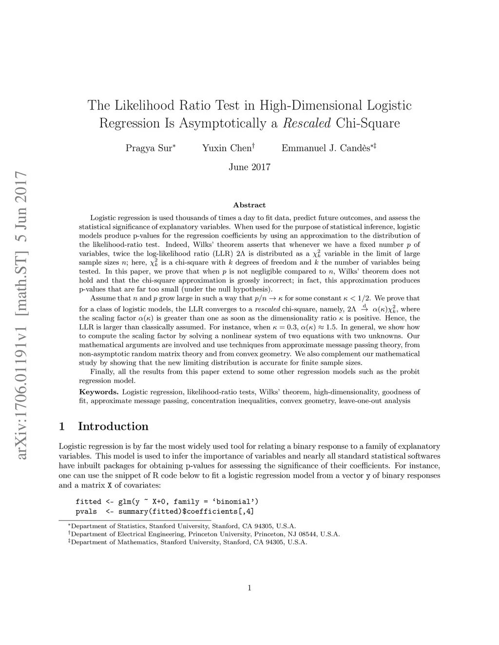Logistic regression is used thousands of times a day to fit data, predict future outcomes, and assess the statistical significance of explanatory variables. When used for the purpose of statistical inference, logistic models produce p-values for the regression coefficients by using an approximation to the distribution of the likelihood-ratio test. Indeed, Wilks' theorem asserts that whenever we have a fixed number of variables, twice the log-likelihood ratio (LLR) is distributed as a variable in the limit of large sample sizes ; here, is the number of variables being tested. In this paper, we prove that when is not negligible compared to , Wilks' theorem does not hold and that the chi-square approximation is grossly incorrect; in fact, this approximation produces p-values that are far too small (under the null hypothesis). Assume that and grow large in such a way that for some constant . We prove that for a class of logistic models, the LLR converges to a rescaled chi-square, namely, , where the scaling factor is greater than one as soon as the dimensionality ratio is positive. Hence, the LLR is larger than classically assumed. For instance, when , . In general, we show how to compute the scaling factor by solving a nonlinear system of two equations with two unknowns. Our mathematical arguments are involved and use techniques from approximate message passing theory, non-asymptotic random matrix theory and convex geometry. We also complement our mathematical study by showing that the new limiting distribution is accurate for finite sample sizes. Finally, all the results from this paper extend to some other regression models such as the probit regression model.