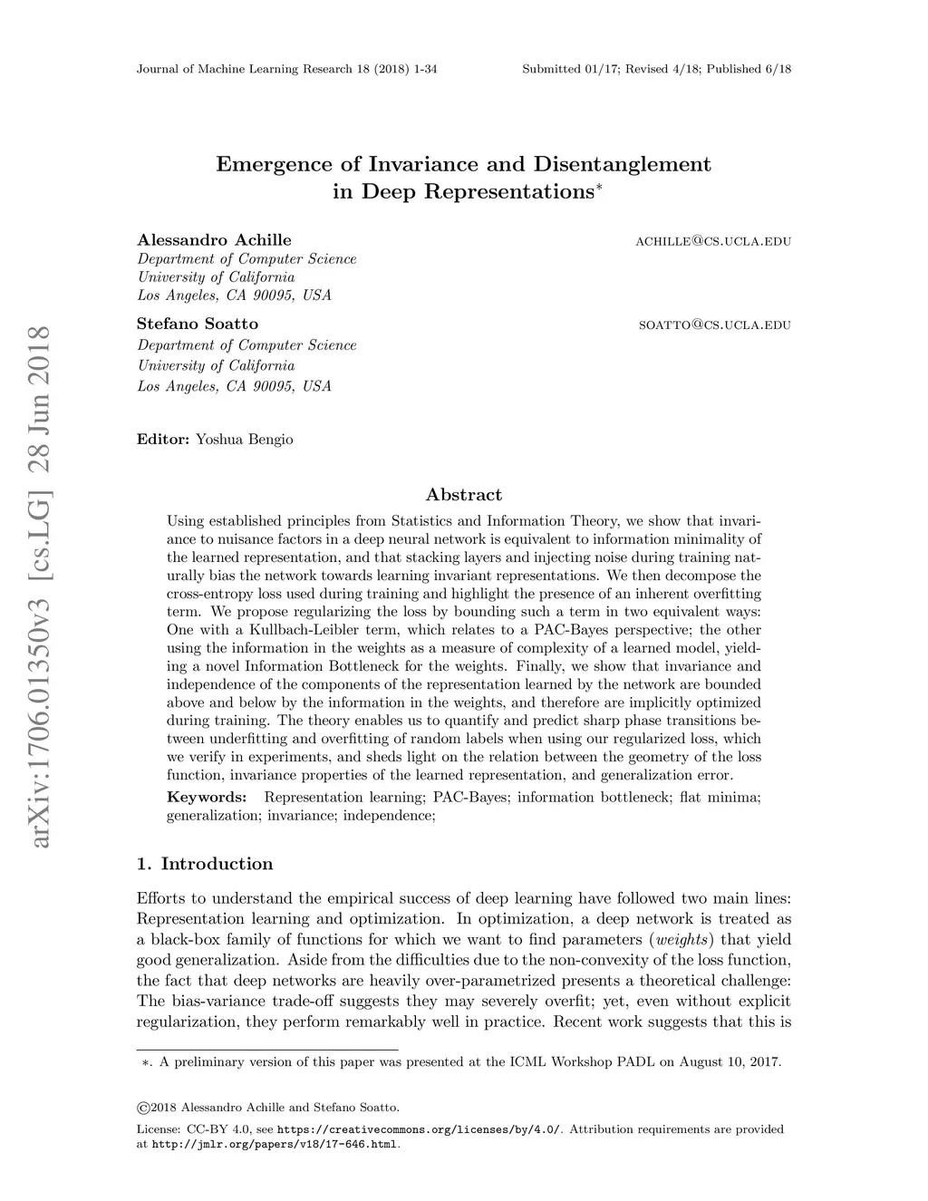 Using established principles from Statistics and Information Theory, we show that invariance to nuisance factors in a deep neural network is equivalent to information minimality of the learned representation, and that stacking layers and injecting noise during training naturally bias the network towards learning invariant representations. We then decompose the cross-entropy loss used during training and highlight the presence of an inherent overfitting term. We propose regularizing the loss by bounding such a term in two equivalent ways: One with a Kullbach-Leibler term, which relates to a PAC-Bayes perspective; the other using the information in the weights as a measure of complexity of a learned model, yielding a novel Information Bottleneck for the weights. Finally, we show that invariance and independence of the components of the representation learned by the network are bounded above and below by the information in the weights, and therefore are implicitly optimized during training. The theory enables us to quantify and predict sharp phase transitions between underfitting and overfitting of random labels when using our regularized loss, which we verify in experiments, and sheds light on the relation between the geometry of the loss function, invariance properties of the learned representation, and generalization error.