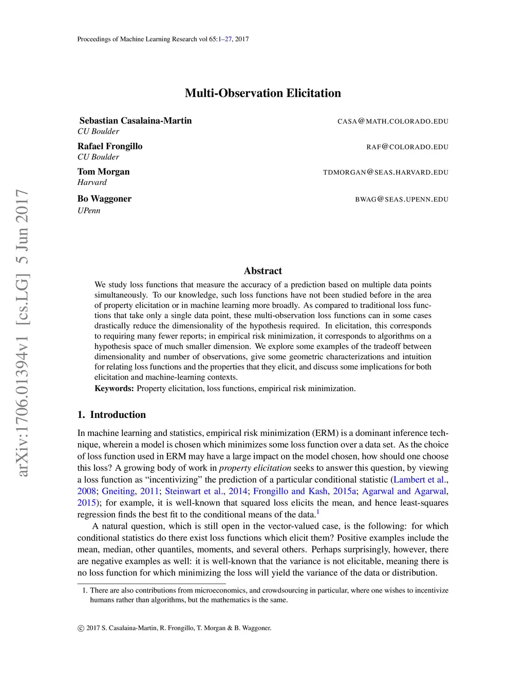 We study loss functions that measure the accuracy of a prediction based on multiple data points simultaneously. To our knowledge, such loss functions have not been studied before in the area of property elicitation or in machine learning more broadly. As compared to traditional loss functions that take only a single data point, these multi-observation loss functions can in some cases drastically reduce the dimensionality of the hypothesis required. In elicitation, this corresponds to requiring many fewer reports; in empirical risk minimization, it corresponds to algorithms on a hypothesis space of much smaller dimension. We explore some examples of the tradeoff between dimensionality and number of observations, give some geometric characterizations and intuition for relating loss functions and the properties that they elicit, and discuss some implications for both elicitation and machine-learning contexts.