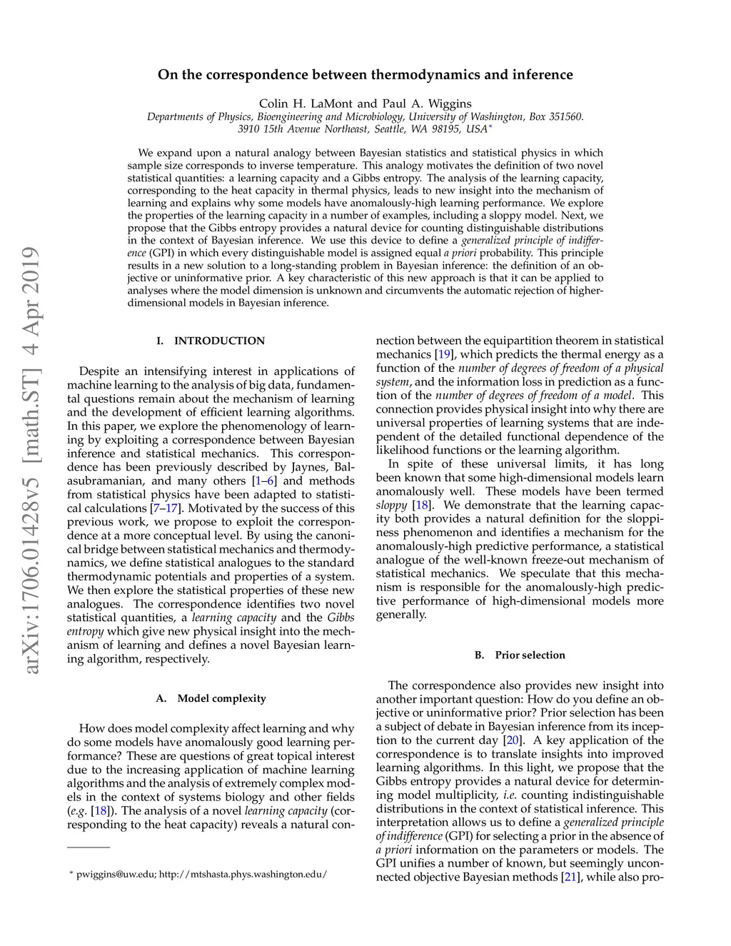We expand upon a natural analogy between Bayesian statistics and statistical physics in which sample size corresponds to inverse temperature. This analogy motivates the definition of two novel statistical quantities: a learning capacity and a Gibbs entropy. The analysis of the learning capacity, corresponding to the heat capacity in thermal physics, leads to new insight into the mechanism of learning and explains why some models have anomalously-high learning performance. We explore the properties of the learning capacity in a number of examples, including a sloppy model. Next, we propose that the Gibbs entropy provides a natural device for counting distinguishable distributions in the context of Bayesian inference. We use this device to define a generalized principle of indifference (GPI) in which every distinguishable model is assigned equal a priori probability. This principle results in a new solution to a long-standing problem in Bayesian inference: the definition of an objective or uninformative prior. A key characteristic of this new approach is that it can be applied to analyses where the model dimension is unknown and circumvents the automatic rejection of higher-dimensional models in Bayesian inference.