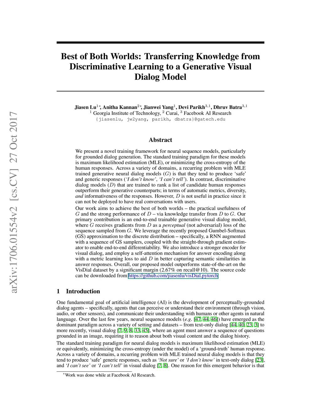We present a novel training framework for neural sequence models, particularly for grounded dialog generation. The standard training paradigm for these models is maximum likelihood estimation (MLE), or minimizing the cross-entropy of the human responses. Across a variety of domains, a recurring problem with MLE trained generative neural dialog models (G) is that they tend to produce 'safe' and generic responses ("I don't know", "I can't tell"). In contrast, discriminative dialog models (D) that are trained to rank a list of candidate human responses outperform their generative counterparts; in terms of automatic metrics, diversity, and informativeness of the responses. However, D is not useful in practice since it cannot be deployed to have real conversations with users. Our work aims to achieve the best of both worlds -- the practical usefulness of G and the strong performance of D -- via knowledge transfer from D to G. Our primary contribution is an end-to-end trainable generative visual dialog model, where G receives gradients from D as a perceptual (not adversarial) loss of the sequence sampled from G. We leverage the recently proposed Gumbel-Softmax (GS) approximation to the discrete distribution -- specifically, an RNN augmented with a sequence of GS samplers, coupled with the straight-through gradient estimator to enable end-to-end differentiability. We also introduce a stronger encoder for visual dialog, and employ a self-attention mechanism for answer encoding along with a metric learning loss to aid D in better capturing semantic similarities in answer responses. Overall, our proposed model outperforms state-of-the-art on the VisDial dataset by a significant margin (2.67% on recall@10). The source code can be downloaded from https://github.com/jiasenlu/visDial.pytorch.