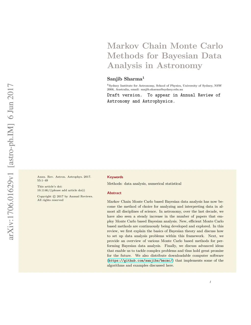 Markov Chain Monte Carlo based Bayesian data analysis has now become the method of choice for analyzing and interpreting data in almost all disciplines of science. In astronomy, over the last decade, we have also seen a steady increase in the number of papers that employ Monte Carlo based Bayesian analysis. New, efficient Monte Carlo based methods are continuously being developed and explored. In this review, we first explain the basics of Bayesian theory and discuss how to set up data analysis problems within this framework. Next, we provide an overview of various Monte Carlo based methods for performing Bayesian data analysis. Finally, we discuss advanced ideas that enable us to tackle complex problems and thus hold great promise for the future. We also distribute downloadable computer software (available at https://github.com/sanjibs/bmcmc/ ) that implements some of the algorithms and examples discussed here.