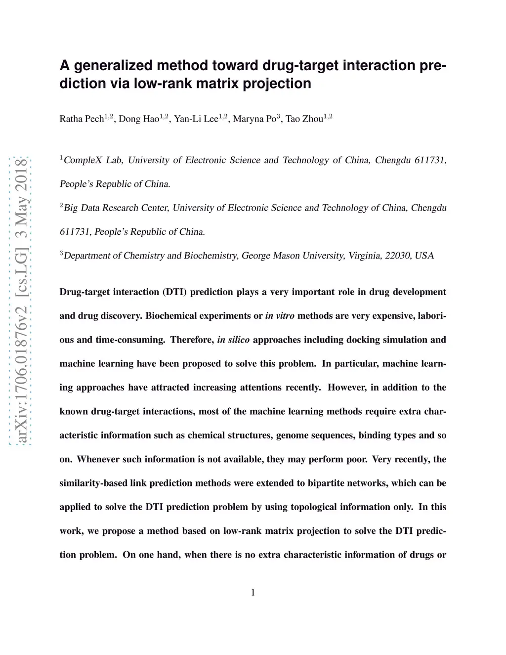 Drug-target interaction (DTI) prediction plays a very important role in drug development and drug discovery. Biochemical experiments or \textit{in vitro} methods are very expensive, laborious and time-consuming. Therefore, \textit{in silico} approaches including docking simulation and machine learning have been proposed to solve this problem. In particular, machine learning approaches have attracted increasing attentions recently. However, in addition to the known drug-target interactions, most of the machine learning methods require extra characteristic information such as chemical structures, genome sequences, binding types and so on. Whenever such information is not available, they may perform poor. Very recently, the similarity-based link prediction methods were extended to bipartite networks, which can be applied to solve the DTI prediction problem by using topological information only. In this work, we propose a method based on low-rank matrix projection to solve the DTI prediction problem. On one hand, when there is no extra characteristic information of drugs or targets, the proposed method utilizes only the known interactions. On the other hand, the proposed method can also utilize the extra characteristic information when it is available and the performances will be remarkably improved. Moreover, the proposed method can predict the interactions associated with new drugs or targets of which we know nothing about their associated interactions, but only some characteristic information. We compare the proposed method with ten baseline methods, e.g., six similarity-based methods that utilize only the known interactions and four methods that utilize the extra characteristic information. The datasets and codes implementing the simulations are available at https://github.com/rathapech/DTI_LMP.