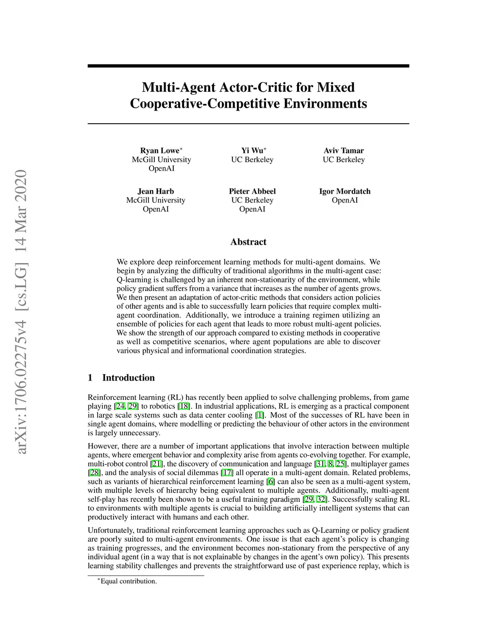 Multi-Agent Actor-Critic for Mixed Cooperative-Competitive Environments
