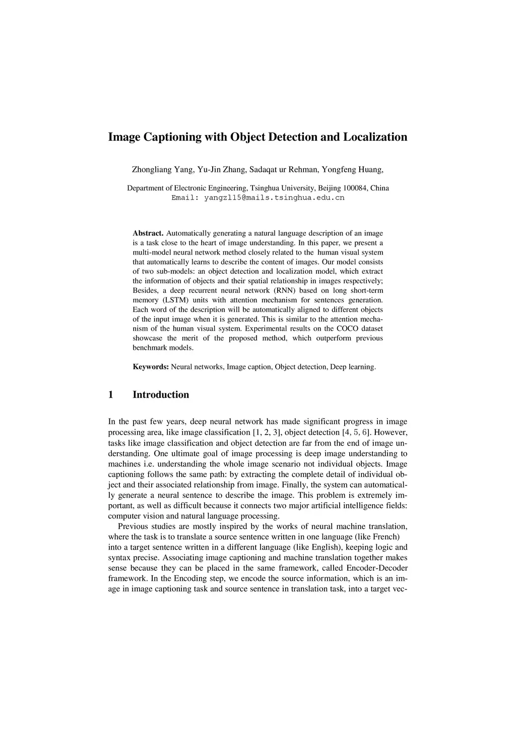 Automatically generating a natural language description of an image is a task close to the heart of image understanding. In this paper, we present a multi-model neural network method closely related to the human visual system that automatically learns to describe the content of images. Our model consists of two sub-models: an object detection and localization model, which extract the information of objects and their spatial relationship in images respectively; Besides, a deep recurrent neural network (RNN) based on long short-term memory (LSTM) units with attention mechanism for sentences generation. Each word of the description will be automatically aligned to different objects of the input image when it is generated. This is similar to the attention mechanism of the human visual system. Experimental results on the COCO dataset showcase the merit of the proposed method, which outperforms previous benchmark models.