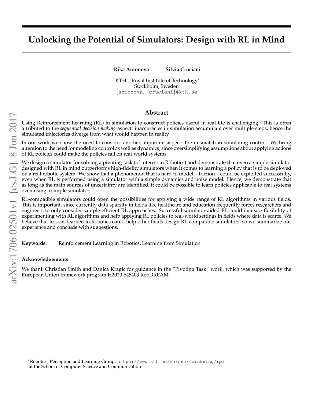 Using Reinforcement Learning (RL) in simulation to construct policies useful in real life is challenging. This is often attributed to the sequential decision making aspect: inaccuracies in simulation accumulate over multiple steps, hence the simulated trajectories diverge from what would happen in reality. In our work we show the need to consider another important aspect: the mismatch in simulating control. We bring attention to the need for modeling control as well as dynamics, since oversimplifying assumptions about applying actions of RL policies could make the policies fail on real-world systems. We design a simulator for solving a pivoting task (of interest in Robotics) and demonstrate that even a simple simulator designed with RL in mind outperforms high-fidelity simulators when it comes to learning a policy that is to be deployed on a real robotic system. We show that a phenomenon that is hard to model - friction - could be exploited successfully, even when RL is performed using a simulator with a simple dynamics and noise model. Hence, we demonstrate that as long as the main sources of uncertainty are identified, it could be possible to learn policies applicable to real systems even using a simple simulator. RL-compatible simulators could open the possibilities for applying a wide range of RL algorithms in various fields. This is important, since currently data sparsity in fields like healthcare and education frequently forces researchers and engineers to only consider sample-efficient RL approaches. Successful simulator-aided RL could increase flexibility of experimenting with RL algorithms and help applying RL policies to real-world settings in fields where data is scarce. We believe that lessons learned in Robotics could help other fields design RL-compatible simulators, so we summarize our experience and conclude with suggestions.