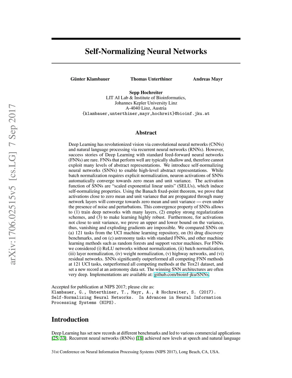 Deep Learning has revolutionized vision via convolutional neural networks (CNNs) and natural language processing via recurrent neural networks (RNNs). However, success stories of Deep Learning with standard feed-forward neural networks (FNNs) are rare. FNNs that perform well are typically shallow and, therefore cannot exploit many levels of abstract representations. We introduce self-normalizing neural networks (SNNs) to enable high-level abstract representations. While batch normalization requires explicit normalization, neuron activations of SNNs automatically converge towards zero mean and unit variance. The activation function of SNNs are "scaled exponential linear units" (SELUs), which induce self-normalizing properties. Using the Banach fixed-point theorem, we prove that activations close to zero mean and unit variance that are propagated through many network layers will converge towards zero mean and unit variance -- even under the presence of noise and perturbations. This convergence property of SNNs allows to (1) train deep networks with many layers, (2) employ strong regularization, and (3) to make learning highly robust. Furthermore, for activations not close to unit variance, we prove an upper and lower bound on the variance, thus, vanishing and exploding gradients are impossible. We compared SNNs on (a) 121 tasks from the UCI machine learning repository, on (b) drug discovery benchmarks, and on (c) astronomy tasks with standard FNNs and other machine learning methods such as random forests and support vector machines. SNNs significantly outperformed all competing FNN methods at 121 UCI tasks, outperformed all competing methods at the Tox21 dataset, and set a new record at an astronomy data set. The winning SNN architectures are often very deep. Implementations are available at: github.com/bioinf-jku/SNNs.