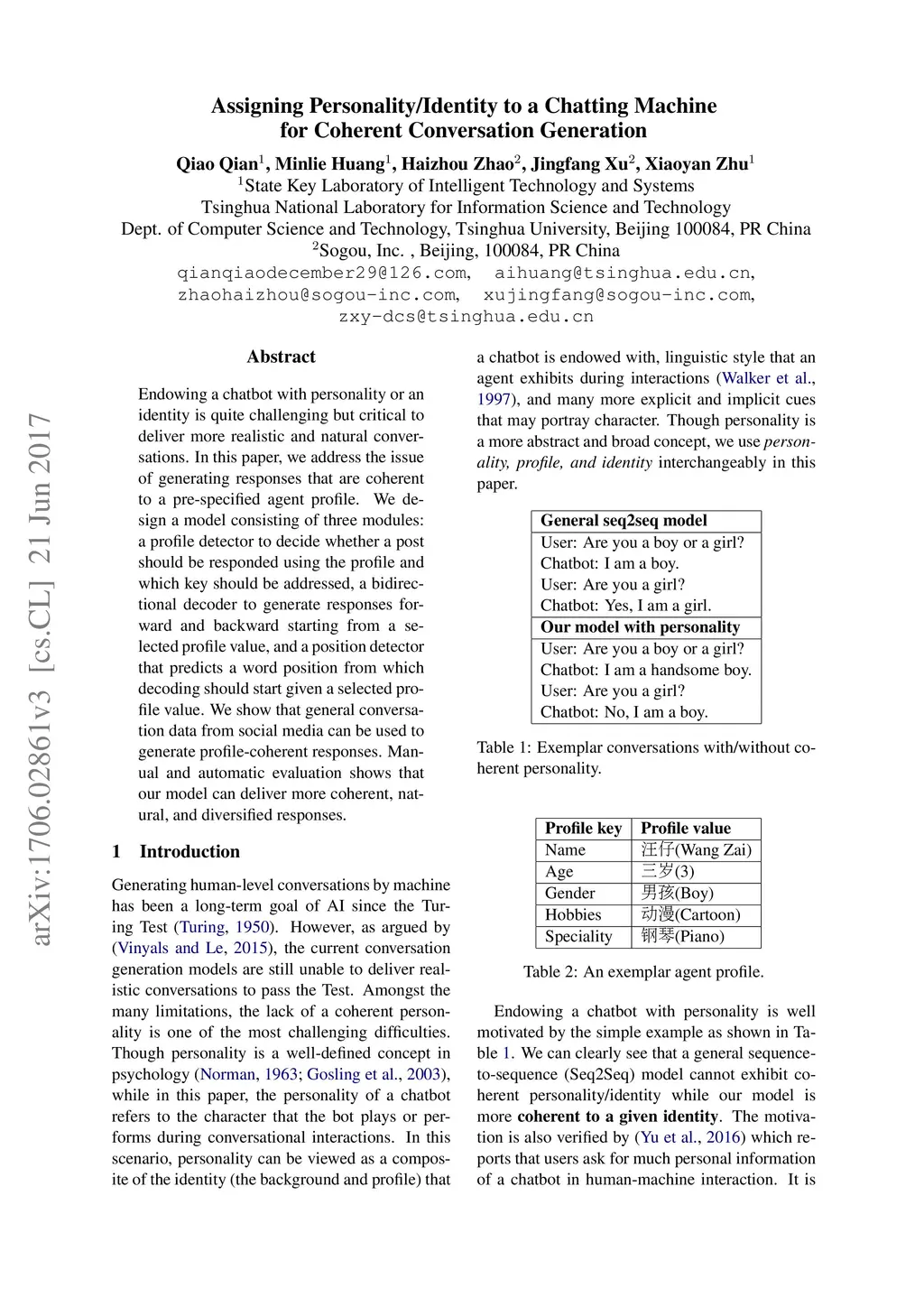 Endowing a chatbot with personality or an identity is quite challenging but critical to deliver more realistic and natural conversations. In this paper, we address the issue of generating responses that are coherent to a pre-specified agent profile. We design a model consisting of three modules: a profile detector to decide whether a post should be responded using the profile and which key should be addressed, a bidirectional decoder to generate responses forward and backward starting from a selected profile value, and a position detector that predicts a word position from which decoding should start given a selected profile value. We show that general conversation data from social media can be used to generate profile-coherent responses. Manual and automatic evaluation shows that our model can deliver more coherent, natural, and diversified responses.