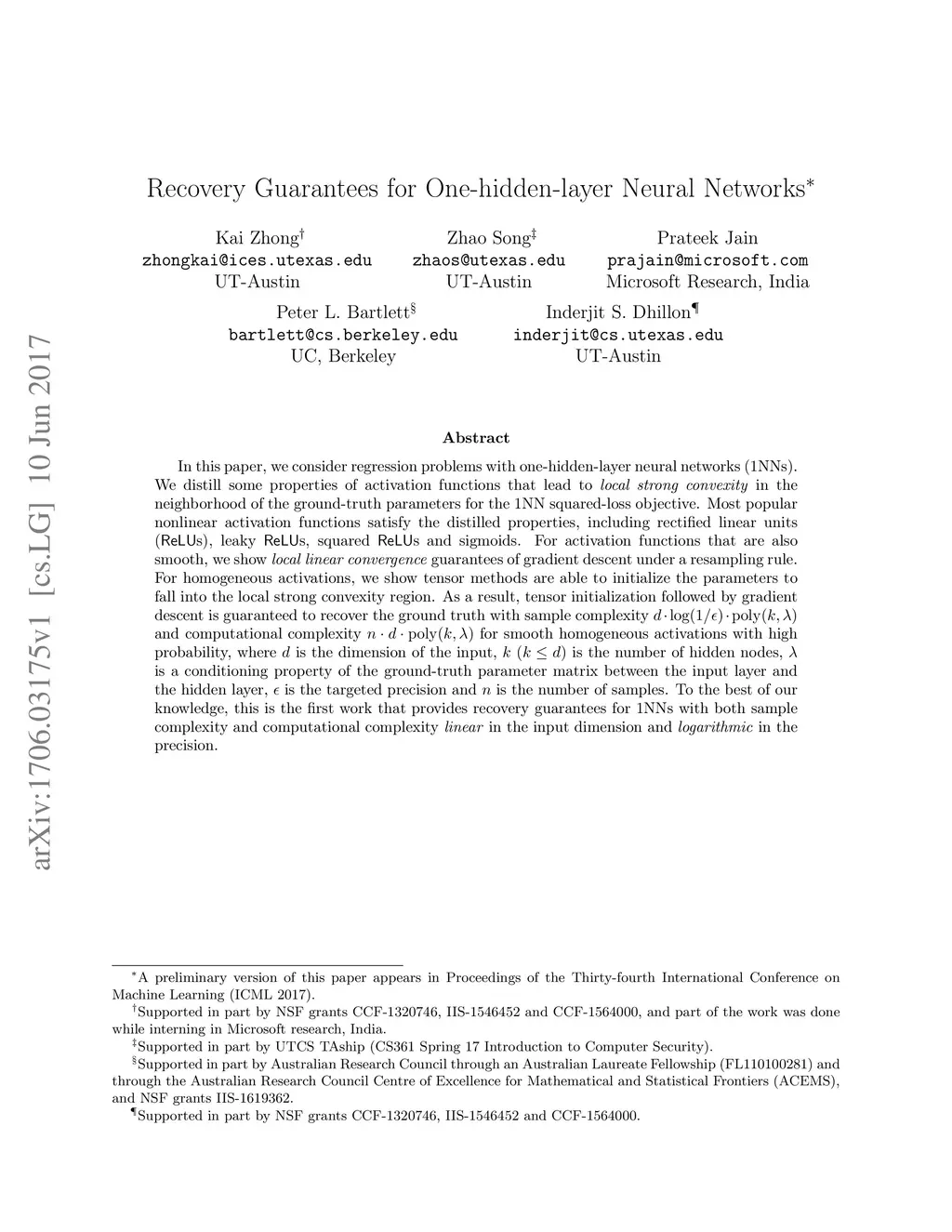 In this paper, we consider regression problems with one-hidden-layer neural networks (1NNs). We distill some properties of activation functions that lead to in the neighborhood of the ground-truth parameters for the 1NN squared-loss objective. Most popular nonlinear activation functions satisfy the distilled properties, including rectified linear units (ReLUs), leaky ReLUs, squared ReLUs and sigmoids. For activation functions that are also smooth, we show guarantees of gradient descent under a resampling rule. For homogeneous activations, we show tensor methods are able to initialize the parameters to fall into the local strong convexity region. As a result, tensor initialization followed by gradient descent is guaranteed to recover the ground truth with sample complexity $ d \cdot \log(1/\epsilon) \cdot \mathrm{poly}(k,\lambda )$ and computational complexity $n\cdot d \cdot \mathrm{poly}(k,\lambda) $ for smooth homogeneous activations with high probability, where is the dimension of the input, () is the number of hidden nodes, is a conditioning property of the ground-truth parameter matrix between the input layer and the hidden layer, is the targeted precision and is the number of samples. To the best of our knowledge, this is the first work that provides recovery guarantees for 1NNs with both sample complexity and computational complexity in the input dimension and in the precision.