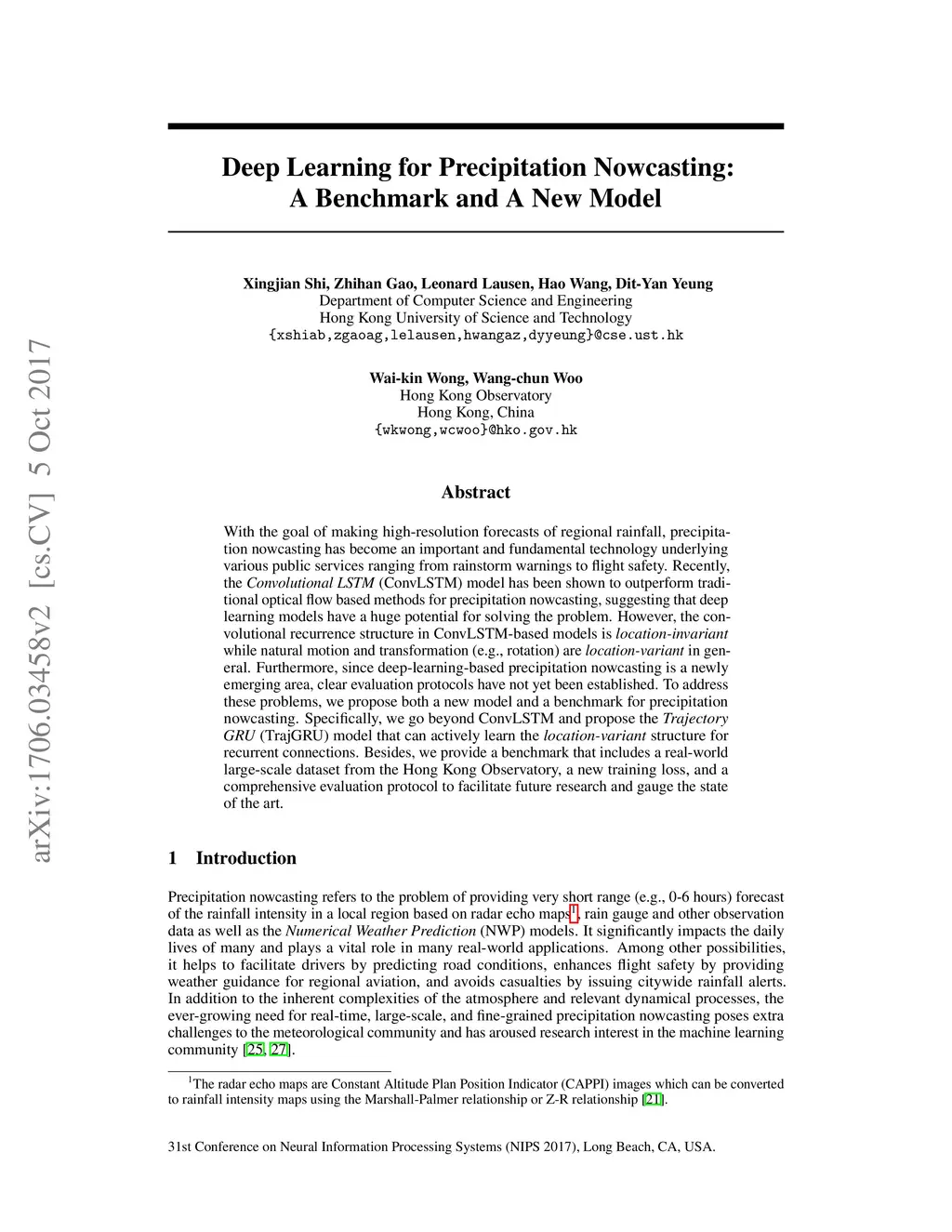 With the goal of making high-resolution forecasts of regional rainfall, precipitation nowcasting has become an important and fundamental technology underlying various public services ranging from rainstorm warnings to flight safety. Recently, the Convolutional LSTM (ConvLSTM) model has been shown to outperform traditional optical flow based methods for precipitation nowcasting, suggesting that deep learning models have a huge potential for solving the problem. However, the convolutional recurrence structure in ConvLSTM-based models is location-invariant while natural motion and transformation (e.g., rotation) are location-variant in general. Furthermore, since deep-learning-based precipitation nowcasting is a newly emerging area, clear evaluation protocols have not yet been established. To address these problems, we propose both a new model and a benchmark for precipitation nowcasting. Specifically, we go beyond ConvLSTM and propose the Trajectory GRU (TrajGRU) model that can actively learn the location-variant structure for recurrent connections. Besides, we provide a benchmark that includes a real-world large-scale dataset from the Hong Kong Observatory, a new training loss, and a comprehensive evaluation protocol to facilitate future research and gauge the state of the art.