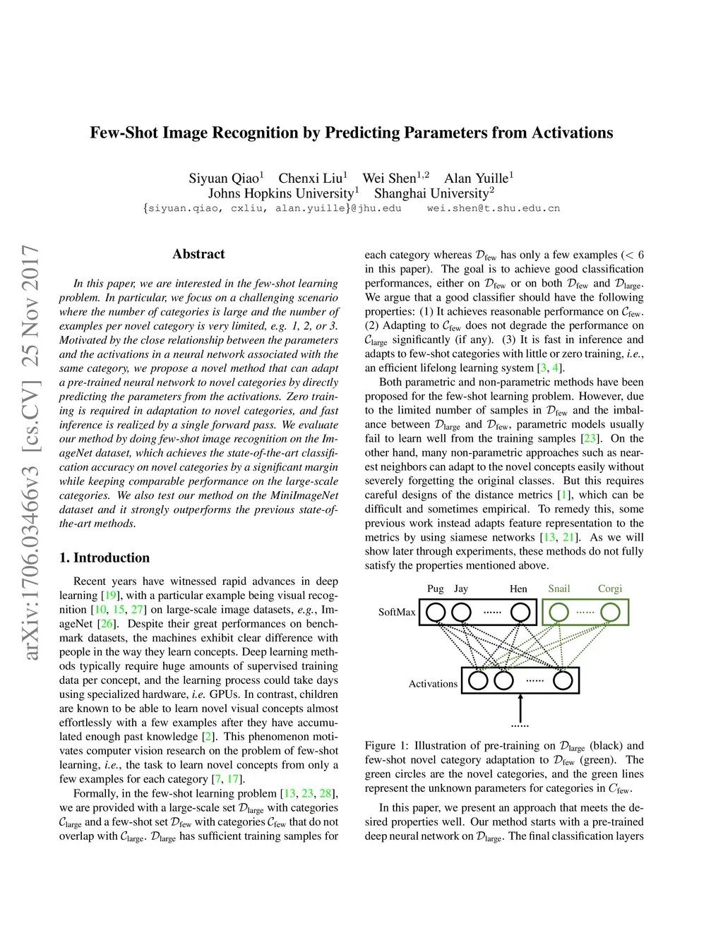 In this paper, we are interested in the few-shot learning problem. In particular, we focus on a challenging scenario where the number of categories is large and the number of examples per novel category is very limited, e.g. 1, 2, or 3. Motivated by the close relationship between the parameters and the activations in a neural network associated with the same category, we propose a novel method that can adapt a pre-trained neural network to novel categories by directly predicting the parameters from the activations. Zero training is required in adaptation to novel categories, and fast inference is realized by a single forward pass. We evaluate our method by doing few-shot image recognition on the ImageNet dataset, which achieves the state-of-the-art classification accuracy on novel categories by a significant margin while keeping comparable performance on the large-scale categories. We also test our method on the MiniImageNet dataset and it strongly outperforms the previous state-of-the-art methods.