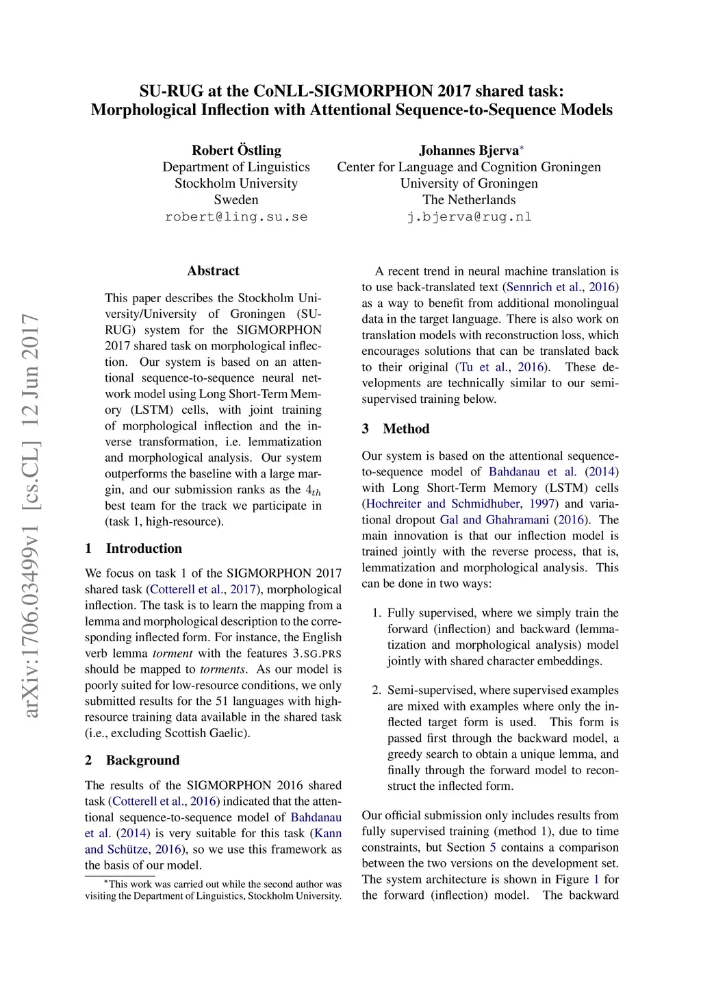 SU-RUG at the CoNLL-SIGMORPHON 2017 shared task: Morphological