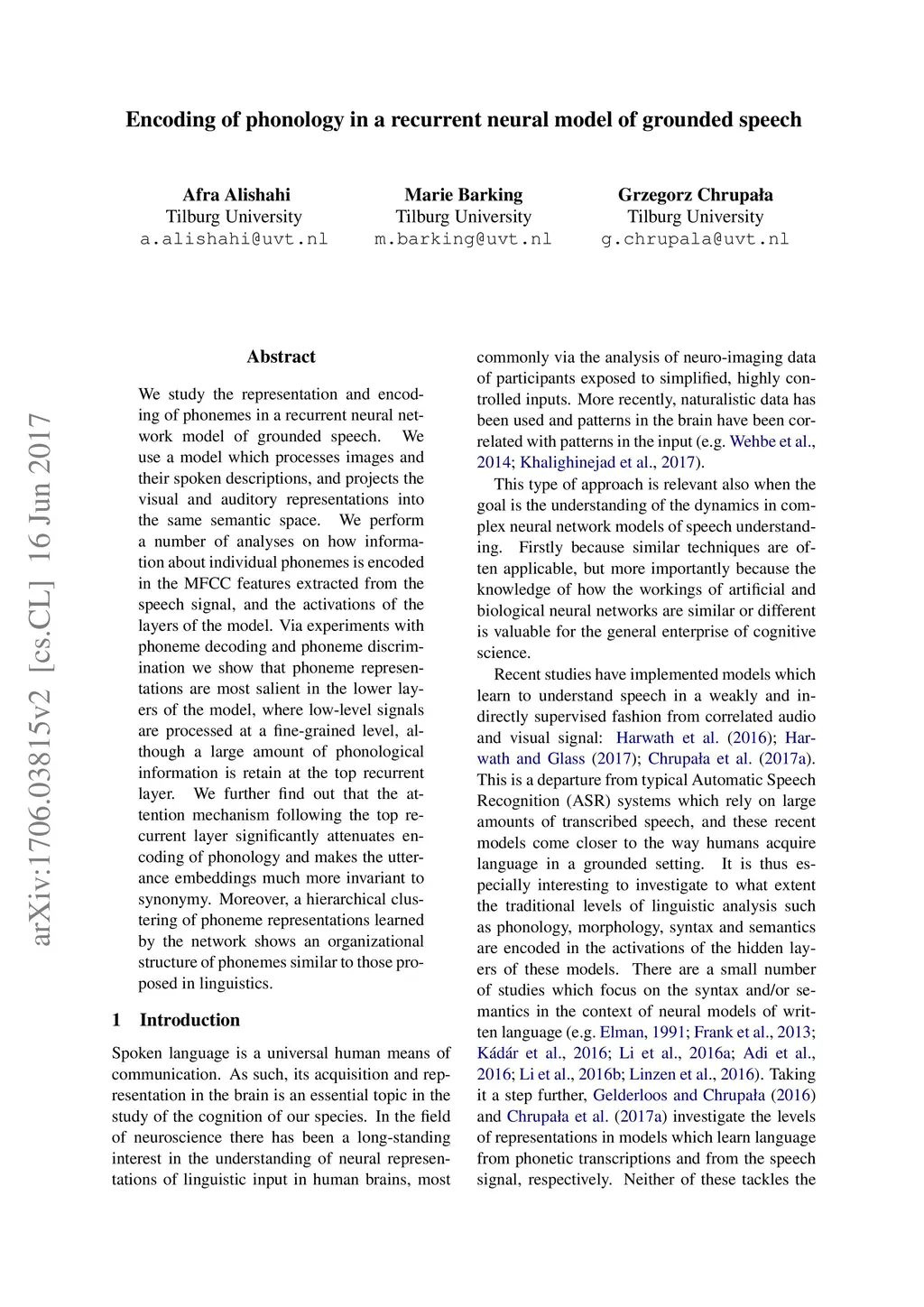 We study the representation and encoding of phonemes in a recurrent neural network model of grounded speech. We use a model which processes images and their spoken descriptions, and projects the visual and auditory representations into the same semantic space. We perform a number of analyses on how information about individual phonemes is encoded in the MFCC features extracted from the speech signal, and the activations of the layers of the model. Via experiments with phoneme decoding and phoneme discrimination we show that phoneme representations are most salient in the lower layers of the model, where low-level signals are processed at a fine-grained level, although a large amount of phonological information is retain at the top recurrent layer. We further find out that the attention mechanism following the top recurrent layer significantly attenuates encoding of phonology and makes the utterance embeddings much more invariant to synonymy. Moreover, a hierarchical clustering of phoneme representations learned by the network shows an organizational structure of phonemes similar to those proposed in linguistics.