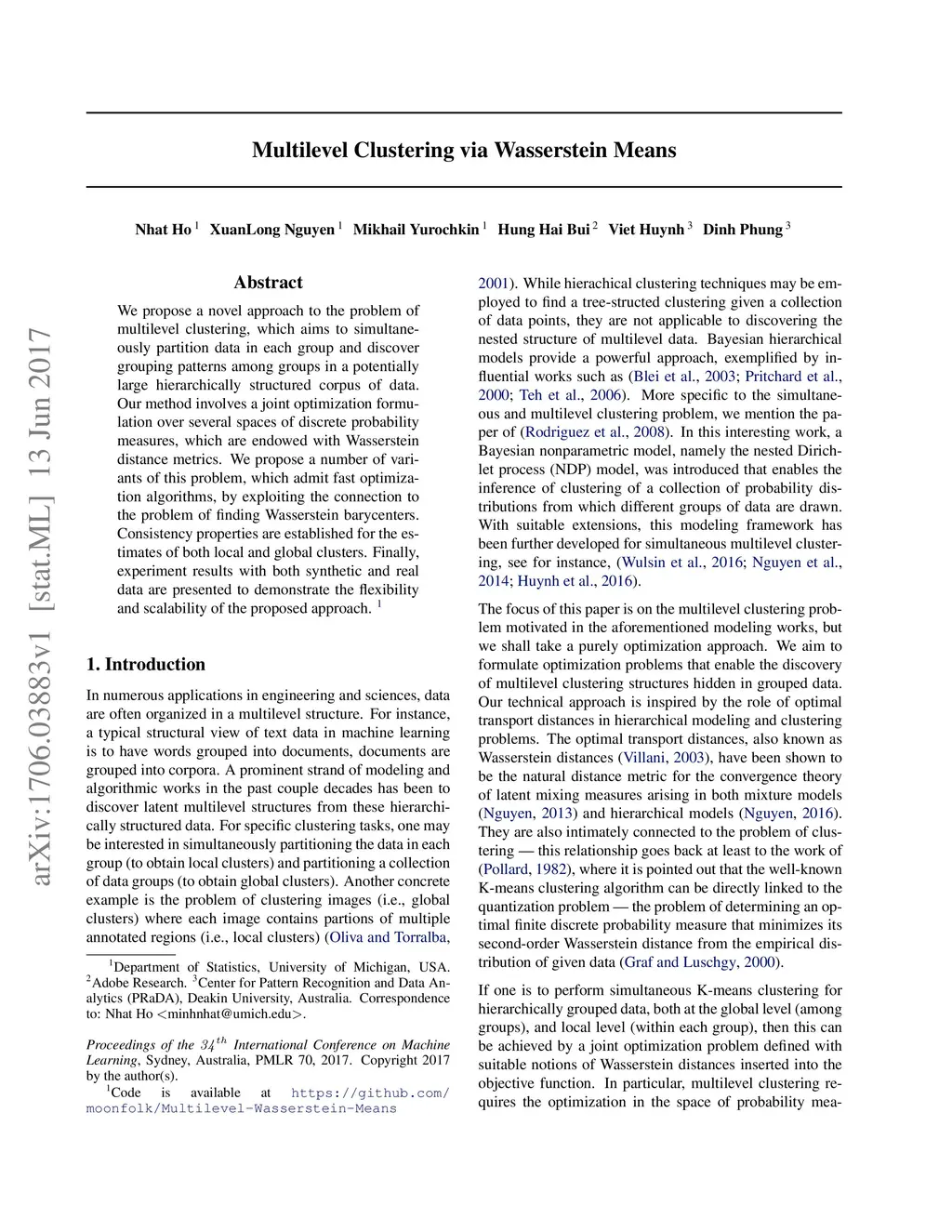 Multilevel Clustering via Wasserstein Means