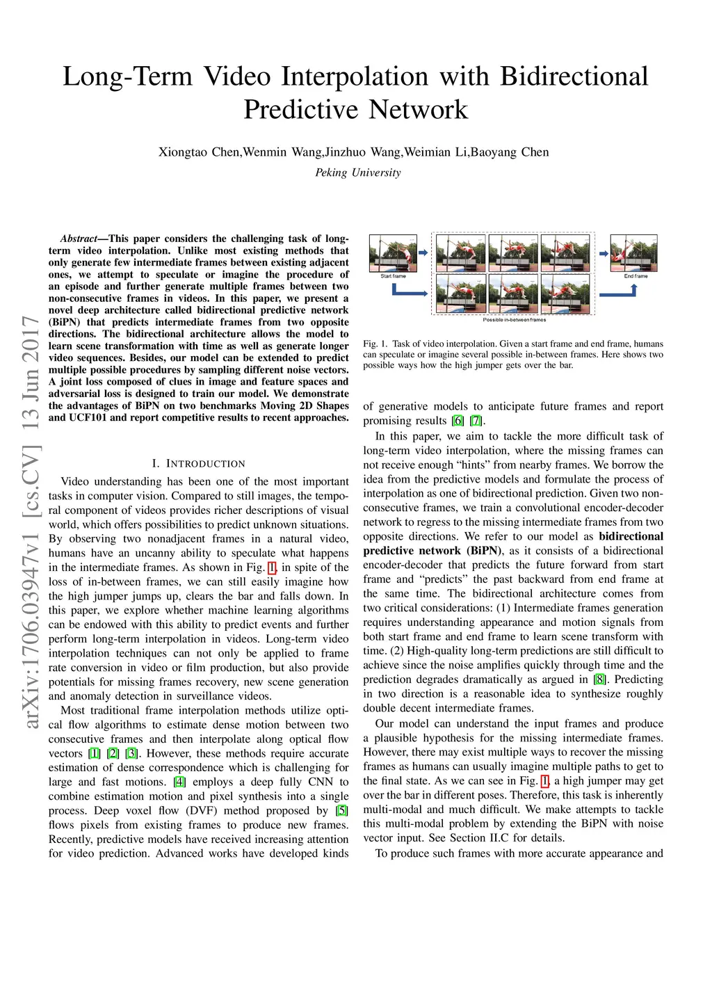 This paper considers the challenging task of long-term video interpolation. Unlike most existing methods that only generate few intermediate frames between existing adjacent ones, we attempt to speculate or imagine the procedure of an episode and further generate multiple frames between two non-consecutive frames in videos. In this paper, we present a novel deep architecture called bidirectional predictive network (BiPN) that predicts intermediate frames from two opposite directions. The bidirectional architecture allows the model to learn scene transformation with time as well as generate longer video sequences. Besides, our model can be extended to predict multiple possible procedures by sampling different noise vectors. A joint loss composed of clues in image and feature spaces and adversarial loss is designed to train our model. We demonstrate the advantages of BiPN on two benchmarks Moving 2D Shapes and UCF101 and report competitive results to recent approaches.