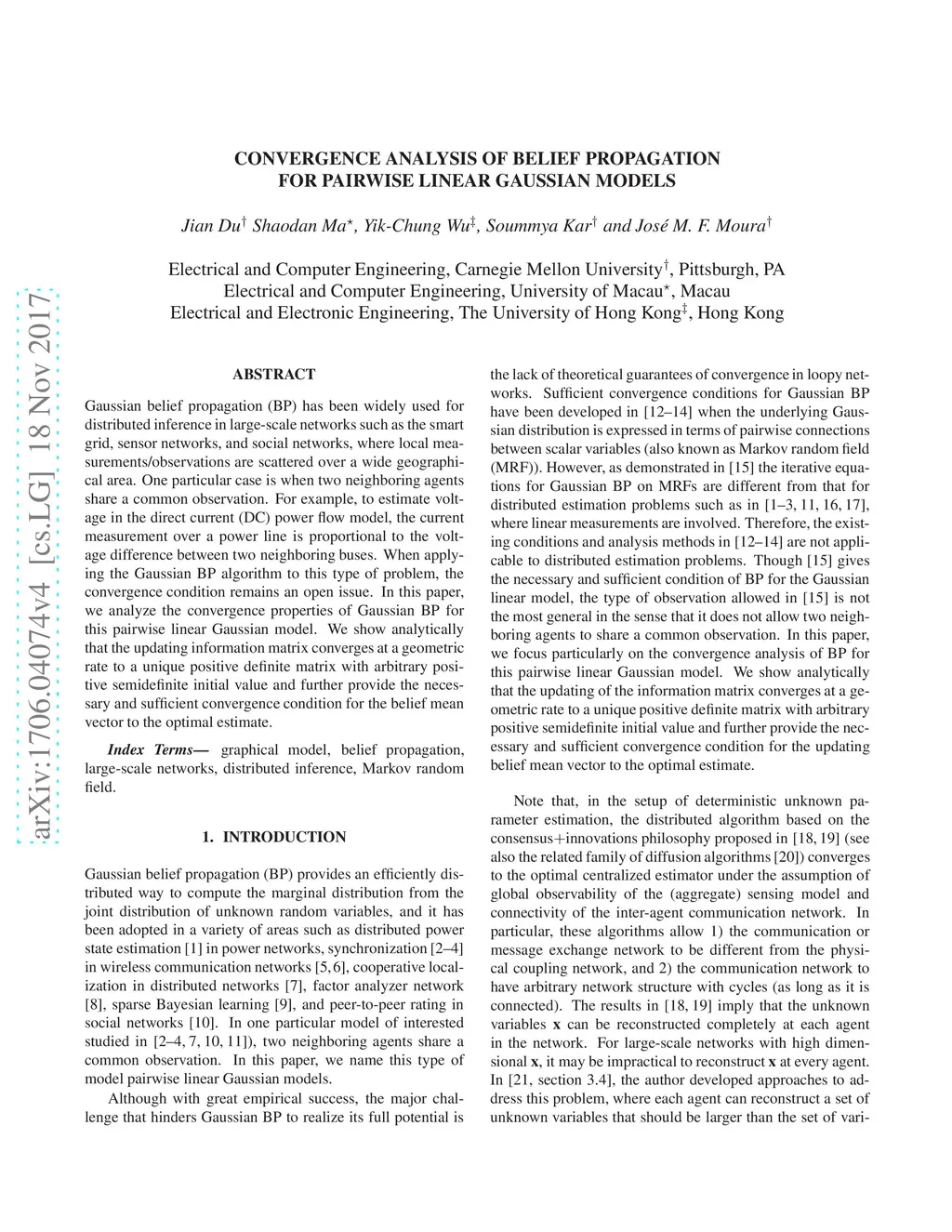 Gaussian belief propagation (BP) has been widely used for distributed inference in large-scale networks such as the smart grid, sensor networks, and social networks, where local measurements/observations are scattered over a wide geographical area. One particular case is when two neighboring agents share a common observation. For example, to estimate voltage in the direct current (DC) power flow model, the current measurement over a power line is proportional to the voltage difference between two neighboring buses. When applying the Gaussian BP algorithm to this type of problem, the convergence condition remains an open issue. In this paper, we analyze the convergence properties of Gaussian BP for this pairwise linear Gaussian model. We show analytically that the updating information matrix converges at a geometric rate to a unique positive definite matrix with arbitrary positive semidefinite initial value and further provide the necessary and sufficient convergence condition for the belief mean vector to the optimal estimate.