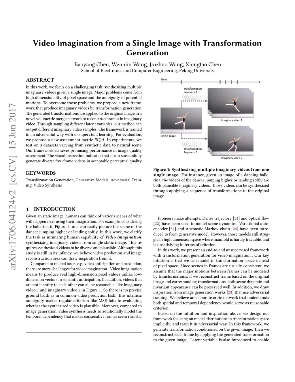 In this work, we focus on a challenging task: synthesizing multiple imaginary videos given a single image. Major problems come from high dimensionality of pixel space and the ambiguity of potential motions. To overcome those problems, we propose a new framework that produce imaginary videos by transformation generation. The generated transformations are applied to the original image in a novel volumetric merge network to reconstruct frames in imaginary video. Through sampling different latent variables, our method can output different imaginary video samples. The framework is trained in an adversarial way with unsupervised learning. For evaluation, we propose a new assessment metric . In experiments, we test on 3 datasets varying from synthetic data to natural scene. Our framework achieves promising performance in image quality assessment. The visual inspection indicates that it can successfully generate diverse five-frame videos in acceptable perceptual quality.