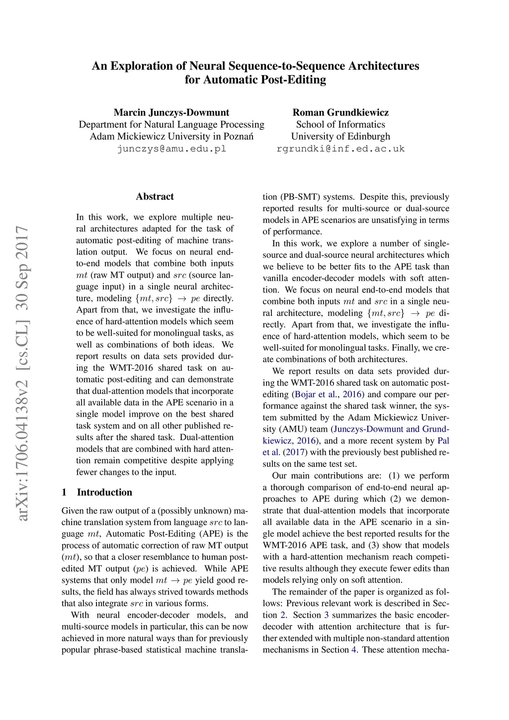 In this work, we explore multiple neural architectures adapted for the task of automatic post-editing of machine translation output. We focus on neural end-to-end models that combine both inputs and in a single neural architecture, modeling directly. Apart from that, we investigate the influence of hard-attention models which seem to be well-suited for monolingual tasks, as well as combinations of both ideas. We report results on data sets provided during the WMT 2016 shared task on automatic post-editing and can demonstrate that double-attention models that incorporate all available data in the APE scenario in a single model improve on the best shared task system and on all other published results after the shared task. Double-attention models that are combined with hard attention remain competitive despite applying fewer changes to the input.