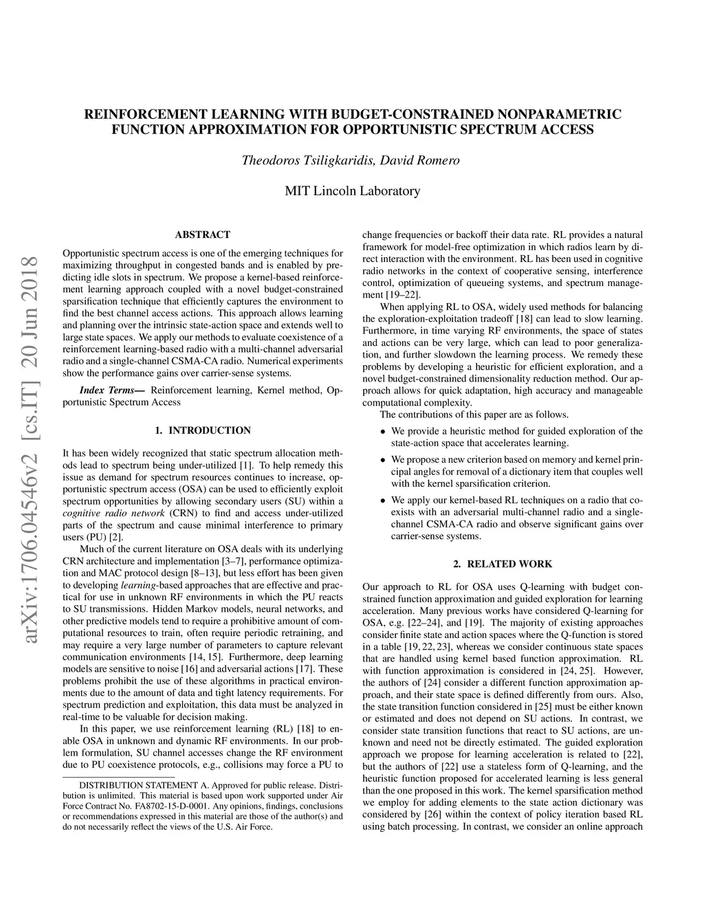 Opportunistic spectrum access is one of the emerging techniques for maximizing throughput in congested bands and is enabled by predicting idle slots in spectrum. We propose a kernel-based reinforcement learning approach coupled with a novel budget-constrained sparsification technique that efficiently captures the environment to find the best channel access actions. This approach allows learning and planning over the intrinsic state-action space and extends well to large state spaces. We apply our methods to evaluate coexistence of a reinforcement learning-based radio with a multi-channel adversarial radio and a single-channel CSMA-CA radio. Numerical experiments show the performance gains over carrier-sense systems.