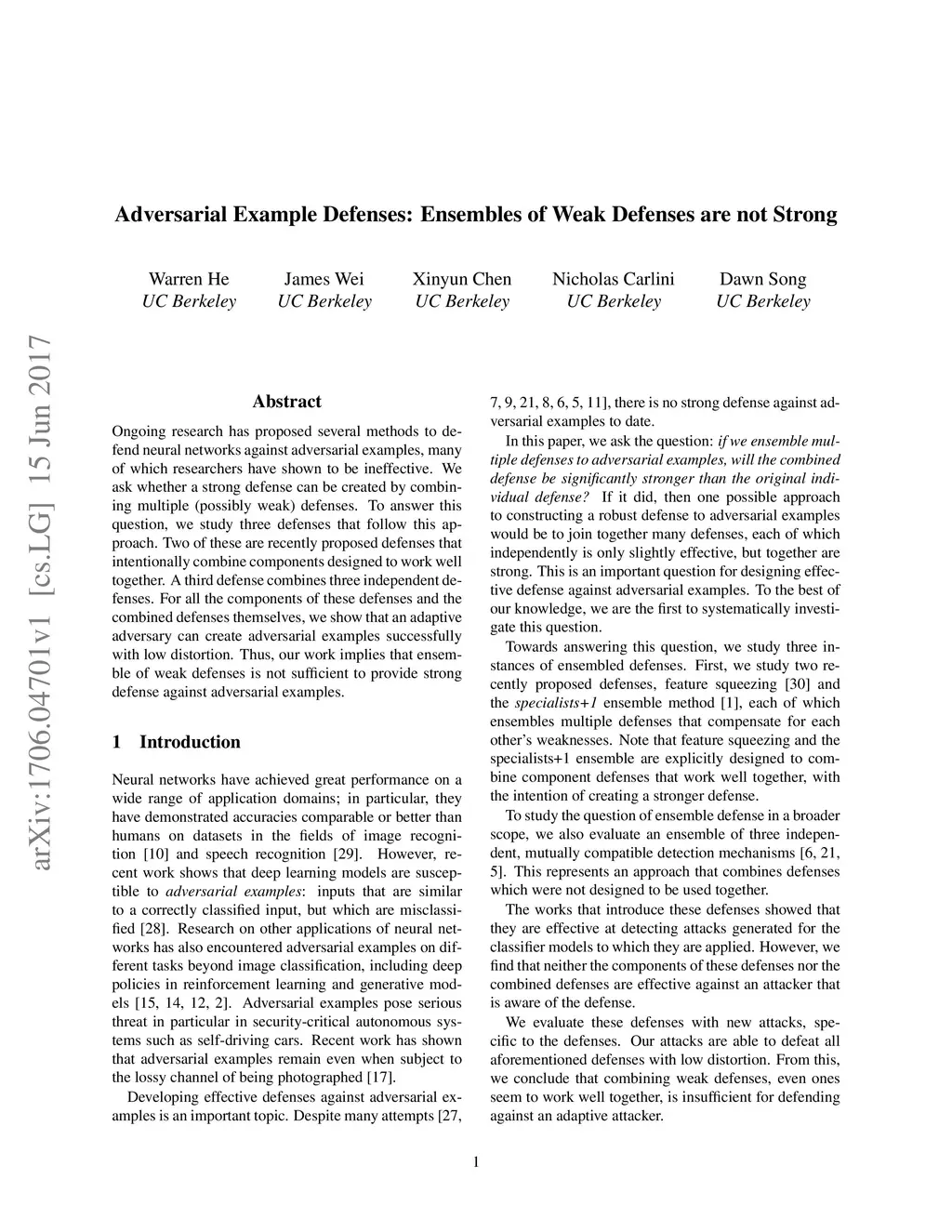 Ongoing research has proposed several methods to defend neural networks against adversarial examples, many of which researchers have shown to be ineffective. We ask whether a strong defense can be created by combining multiple (possibly weak) defenses. To answer this question, we study three defenses that follow this approach. Two of these are recently proposed defenses that intentionally combine components designed to work well together. A third defense combines three independent defenses. For all the components of these defenses and the combined defenses themselves, we show that an adaptive adversary can create adversarial examples successfully with low distortion. Thus, our work implies that ensemble of weak defenses is not sufficient to provide strong defense against adversarial examples.