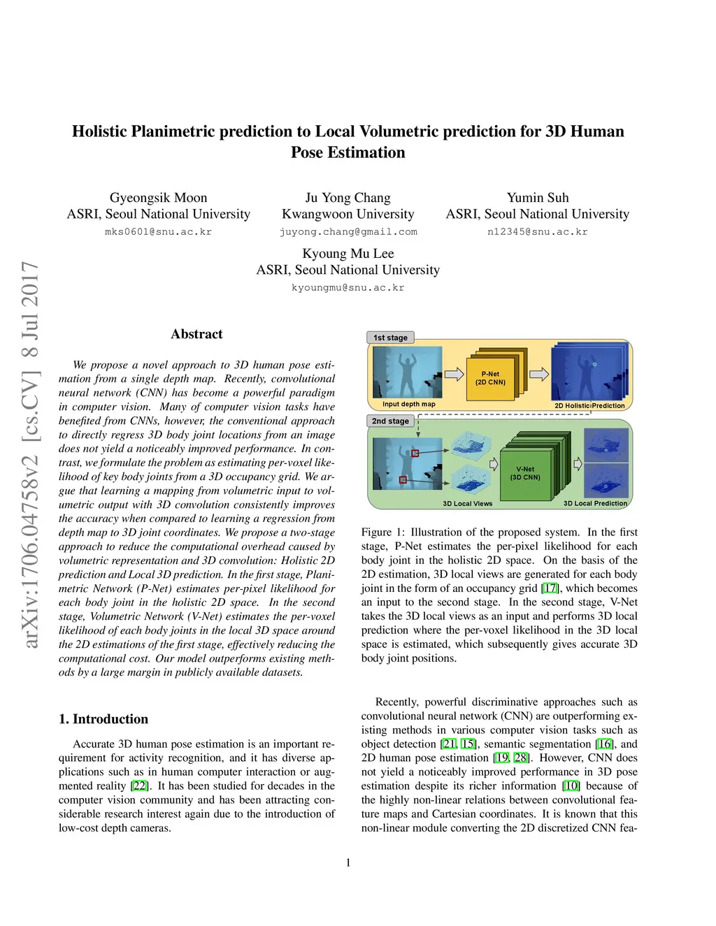 We propose a novel approach to 3D human pose estimation from a single depth map. Recently, convolutional neural network (CNN) has become a powerful paradigm in computer vision. Many of computer vision tasks have benefited from CNNs, however, the conventional approach to directly regress 3D body joint locations from an image does not yield a noticeably improved performance. In contrast, we formulate the problem as estimating per-voxel likelihood of key body joints from a 3D occupancy grid. We argue that learning a mapping from volumetric input to volumetric output with 3D convolution consistently improves the accuracy when compared to learning a regression from depth map to 3D joint coordinates. We propose a two-stage approach to reduce the computational overhead caused by volumetric representation and 3D convolution: Holistic 2D prediction and Local 3D prediction. In the first stage, Planimetric Network (P-Net) estimates per-pixel likelihood for each body joint in the holistic 2D space. In the second stage, Volumetric Network (V-Net) estimates the per-voxel likelihood of each body joints in the local 3D space around the 2D estimations of the first stage, effectively reducing the computational cost. Our model outperforms existing methods by a large margin in publicly available datasets.