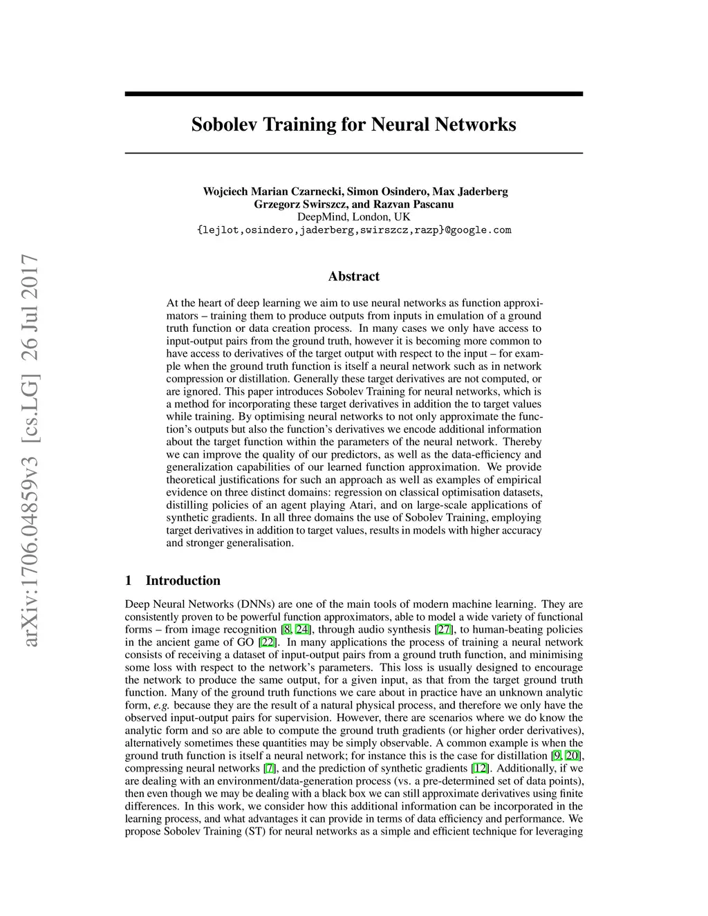 At the heart of deep learning we aim to use neural networks as function approximators - training them to produce outputs from inputs in emulation of a ground truth function or data creation process. In many cases we only have access to input-output pairs from the ground truth, however it is becoming more common to have access to derivatives of the target output with respect to the input - for example when the ground truth function is itself a neural network such as in network compression or distillation. Generally these target derivatives are not computed, or are ignored. This paper introduces Sobolev Training for neural networks, which is a method for incorporating these target derivatives in addition the to target values while training. By optimising neural networks to not only approximate the function's outputs but also the function's derivatives we encode additional information about the target function within the parameters of the neural network. Thereby we can improve the quality of our predictors, as well as the data-efficiency and generalization capabilities of our learned function approximation. We provide theoretical justifications for such an approach as well as examples of empirical evidence on three distinct domains: regression on classical optimisation datasets, distilling policies of an agent playing Atari, and on large-scale applications of synthetic gradients. In all three domains the use of Sobolev Training, employing target derivatives in addition to target values, results in models with higher accuracy and stronger generalisation.
