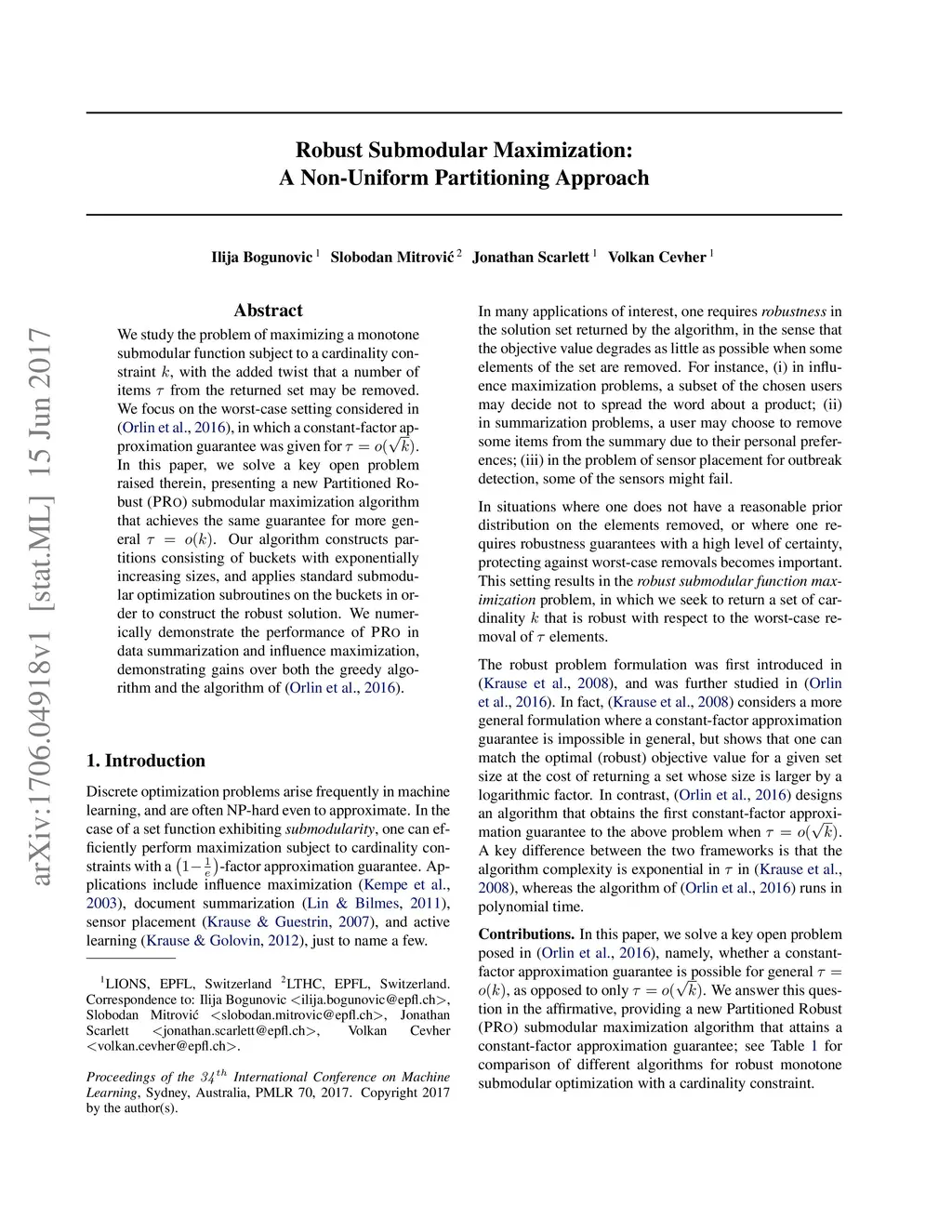 We study the problem of maximizing a monotone submodular function subject to a cardinality constraint , with the added twist that a number of items from the returned set may be removed. We focus on the worst-case setting considered in (Orlin et al., 2016), in which a constant-factor approximation guarantee was given for . In this paper, we solve a key open problem raised therein, presenting a new Partitioned Robust (PRo) submodular maximization algorithm that achieves the same guarantee for more general . Our algorithm constructs partitions consisting of buckets with exponentially increasing sizes, and applies standard submodular optimization subroutines on the buckets in order to construct the robust solution. We numerically demonstrate the performance of PRo in data summarization and influence maximization, demonstrating gains over both the greedy algorithm and the algorithm of (Orlin et al., 2016).