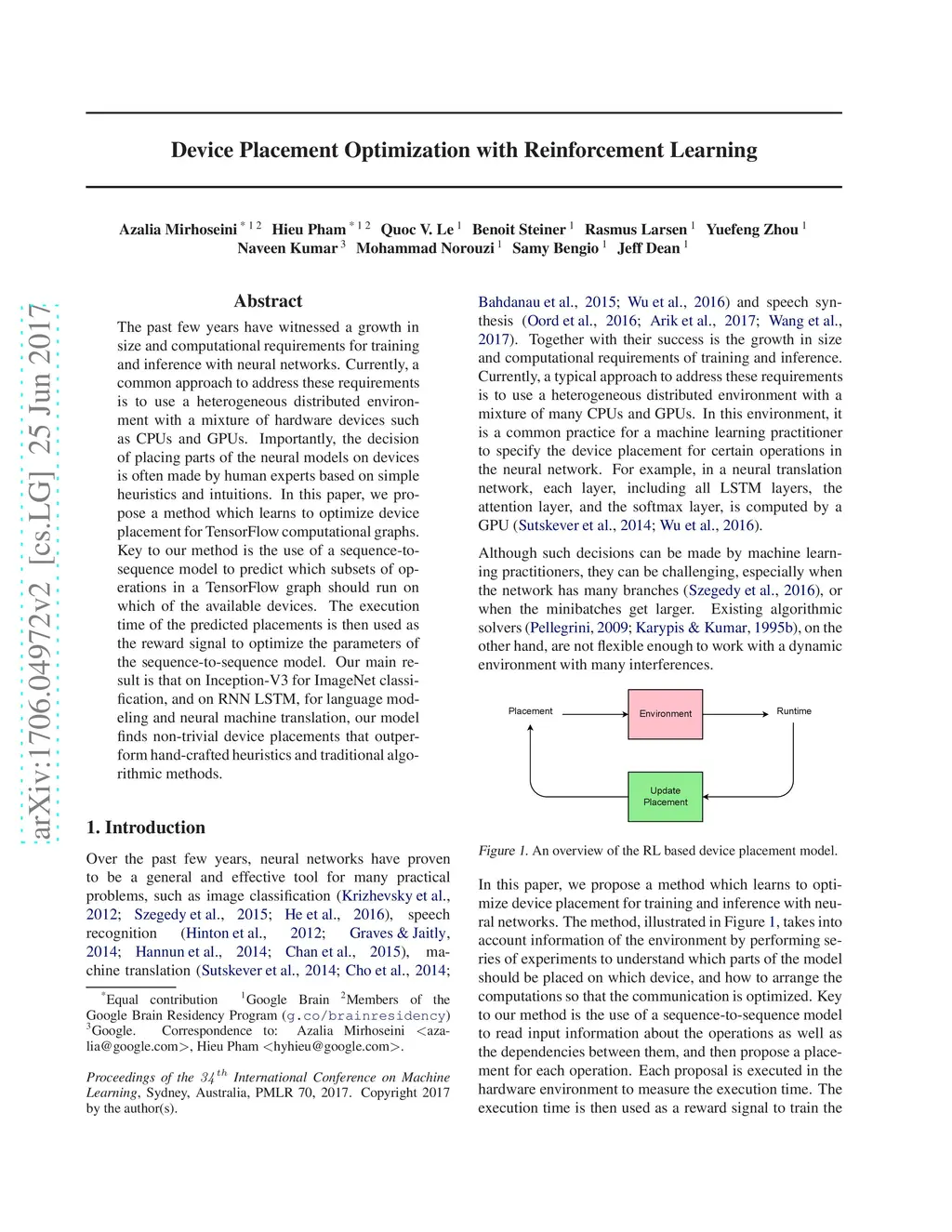 The past few years have witnessed a growth in size and computational requirements for training and inference with neural networks. Currently, a common approach to address these requirements is to use a heterogeneous distributed environment with a mixture of hardware devices such as CPUs and GPUs. Importantly, the decision of placing parts of the neural models on devices is often made by human experts based on simple heuristics and intuitions. In this paper, we propose a method which learns to optimize device placement for TensorFlow computational graphs. Key to our method is the use of a sequence-to-sequence model to predict which subsets of operations in a TensorFlow graph should run on which of the available devices. The execution time of the predicted placements is then used as the reward signal to optimize the parameters of the sequence-to-sequence model. Our main result is that on Inception-V3 for ImageNet classification, and on RNN LSTM, for language modeling and neural machine translation, our model finds non-trivial device placements that outperform hand-crafted heuristics and traditional algorithmic methods.