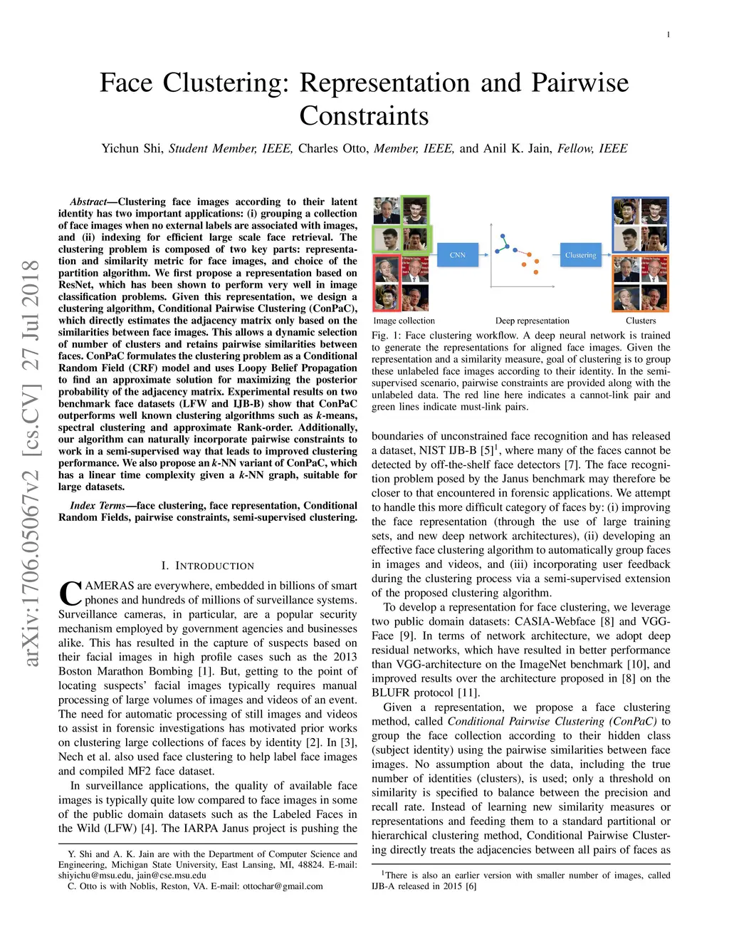 Clustering face images according to their identity has two important applications: (i) grouping a collection of face images when no external labels are associated with images, and (ii) indexing for efficient large scale face retrieval. The clustering problem is composed of two key parts: face representation and choice of similarity for grouping faces. We first propose a representation based on ResNet, which has been shown to perform very well in image classification problems. Given this representation, we design a clustering algorithm, Conditional Pairwise Clustering (ConPaC), which directly estimates the adjacency matrix only based on the similarity between face images. This allows a dynamic selection of number of clusters and retains pairwise similarity between faces. ConPaC formulates the clustering problem as a Conditional Random Field (CRF) model and uses Loopy Belief Propagation to find an approximate solution for maximizing the posterior probability of the adjacency matrix. Experimental results on two benchmark face datasets (LFW and IJB-B) show that ConPaC outperforms well known clustering algorithms such as k-means, spectral clustering and approximate rank-order. Additionally, our algorithm can naturally incorporate pairwise constraints to obtain a semi-supervised version that leads to improved clustering performance. We also propose an k-NN variant of ConPaC, which has a linear time complexity given a k-NN graph, suitable for large datasets.