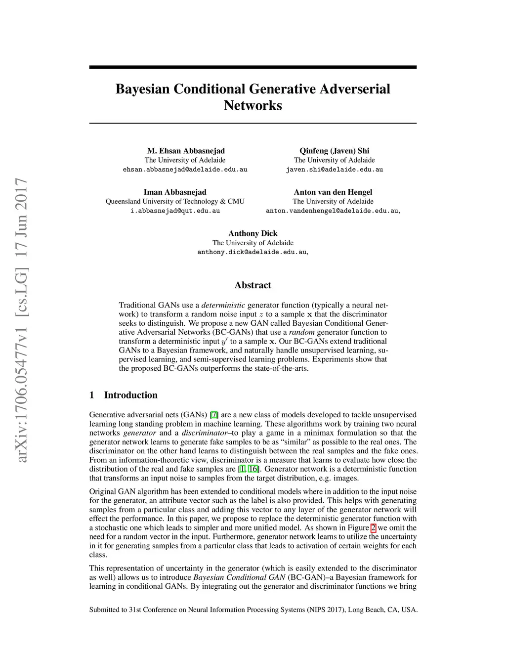 Traditional GANs use a deterministic generator function (typically a neural network) to transform a random noise input to a sample that the discriminator seeks to distinguish. We propose a new GAN called Bayesian Conditional Generative Adversarial Networks (BC-GANs) that use a random generator function to transform a deterministic input to a sample . Our BC-GANs extend traditional GANs to a Bayesian framework, and naturally handle unsupervised learning, supervised learning, and semi-supervised learning problems. Experiments show that the proposed BC-GANs outperforms the state-of-the-arts.