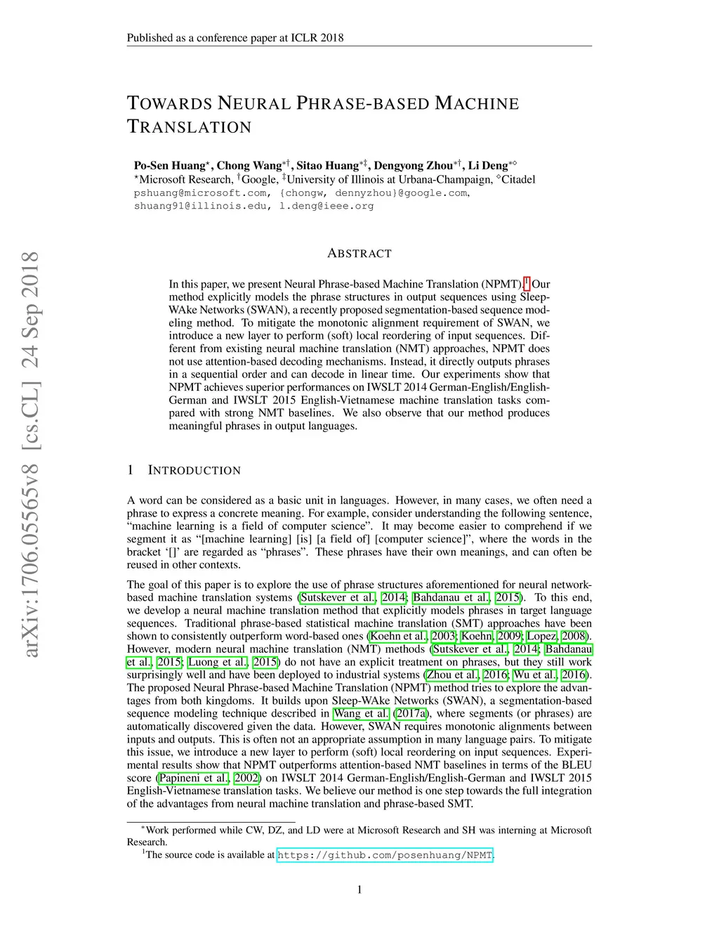 In this paper, we present Neural Phrase-based Machine Translation (NPMT). Our method explicitly models the phrase structures in output sequences using Sleep-WAke Networks (SWAN), a recently proposed segmentation-based sequence modeling method. To mitigate the monotonic alignment requirement of SWAN, we introduce a new layer to perform (soft) local reordering of input sequences. Different from existing neural machine translation (NMT) approaches, NPMT does not use attention-based decoding mechanisms. Instead, it directly outputs phrases in a sequential order and can decode in linear time. Our experiments show that NPMT achieves superior performances on IWSLT 2014 German-English/English-German and IWSLT 2015 English-Vietnamese machine translation tasks compared with strong NMT baselines. We also observe that our method produces meaningful phrases in output languages.