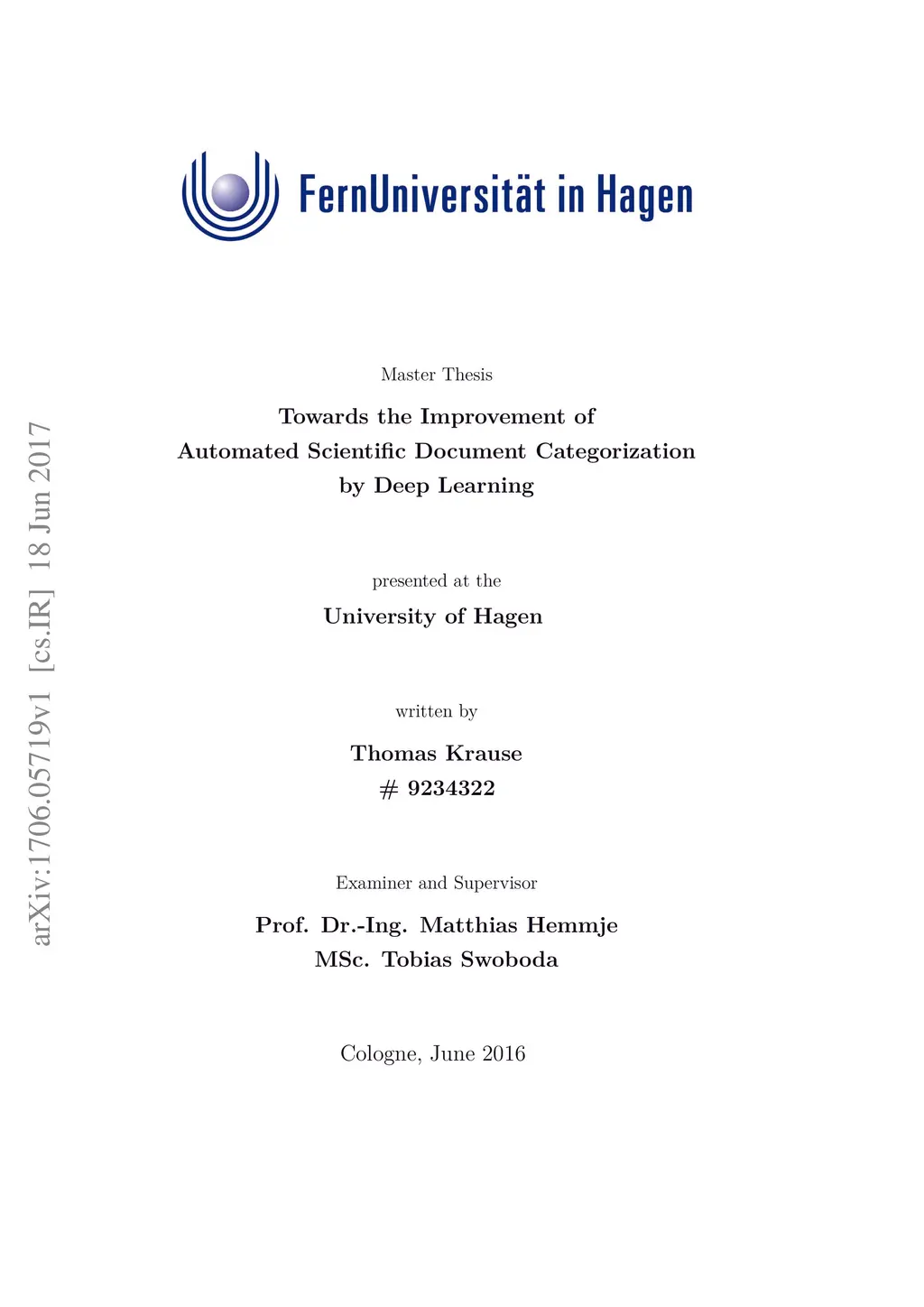 This master thesis describes an algorithm for automated categorization of scientific documents using deep learning techniques and compares the results to the results of existing classification algorithms. As an additional goal a reusable API is to be developed allowing the automation of classification tasks in existing software. A design will be proposed using a convolutional neural network as a classifier and integrating this into a REST based API. This is then used as the basis for an actual proof of concept implementation presented as well in this thesis. It will be shown that the deep learning classifier provides very good result in the context of multi-class document categorization and that it is feasible to integrate such classifiers into a larger ecosystem using REST based services.