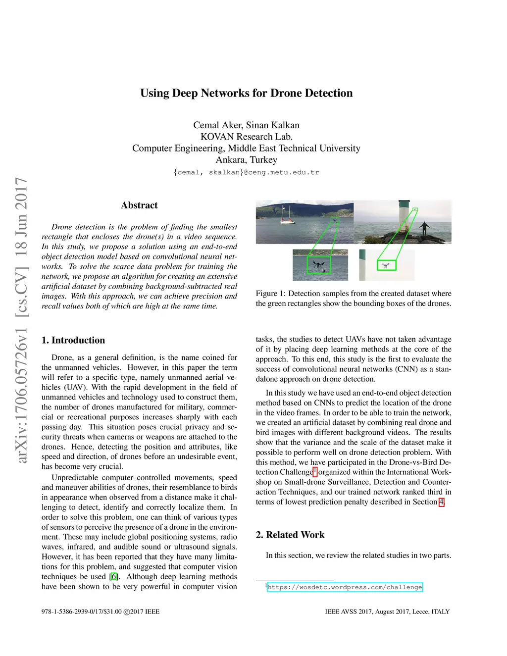 Drone detection is the problem of finding the smallest rectangle that encloses the drone(s) in a video sequence. In this study, we propose a solution using an end-to-end object detection model based on convolutional neural networks. To solve the scarce data problem for training the network, we propose an algorithm for creating an extensive artificial dataset by combining background-subtracted real images. With this approach, we can achieve precision and recall values both of which are high at the same time.