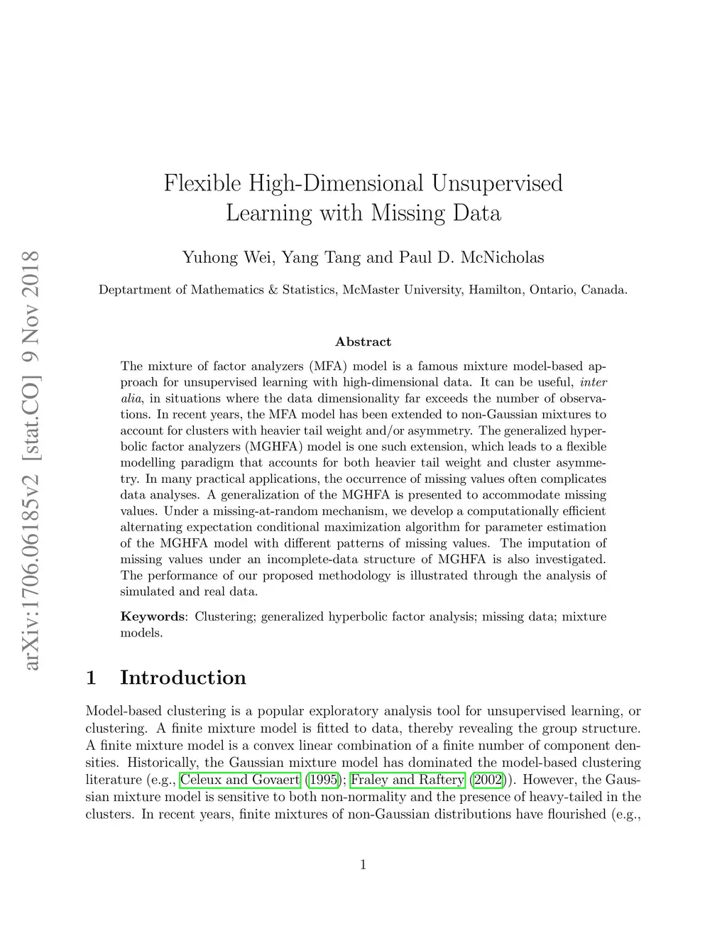 The mixture of factor analyzers (MFA) model is a famous mixture model-based approach for unsupervised learning with high-dimensional data. It can be useful, inter alia, in situations where the data dimensionality far exceeds the number of observations. In recent years, the MFA model has been extended to non-Gaussian mixtures to account for clusters with heavier tail weight and/or asymmetry. The generalized hyperbolic factor analyzers (MGHFA) model is one such extension, which leads to a flexible modelling paradigm that accounts for both heavier tail weight and cluster asymmetry. In many practical applications, the occurrence of missing values often complicates data analyses. A generalization of the MGHFA is presented to accommodate missing values. Under a missing-at-random mechanism, we develop a computationally efficient alternating expectation conditional maximization algorithm for parameter estimation of the MGHFA model with different patterns of missing values. The imputation of missing values under an incomplete-data structure of MGHFA is also investigated. The performance of our proposed methodology is illustrated through the analysis of simulated and real data.
