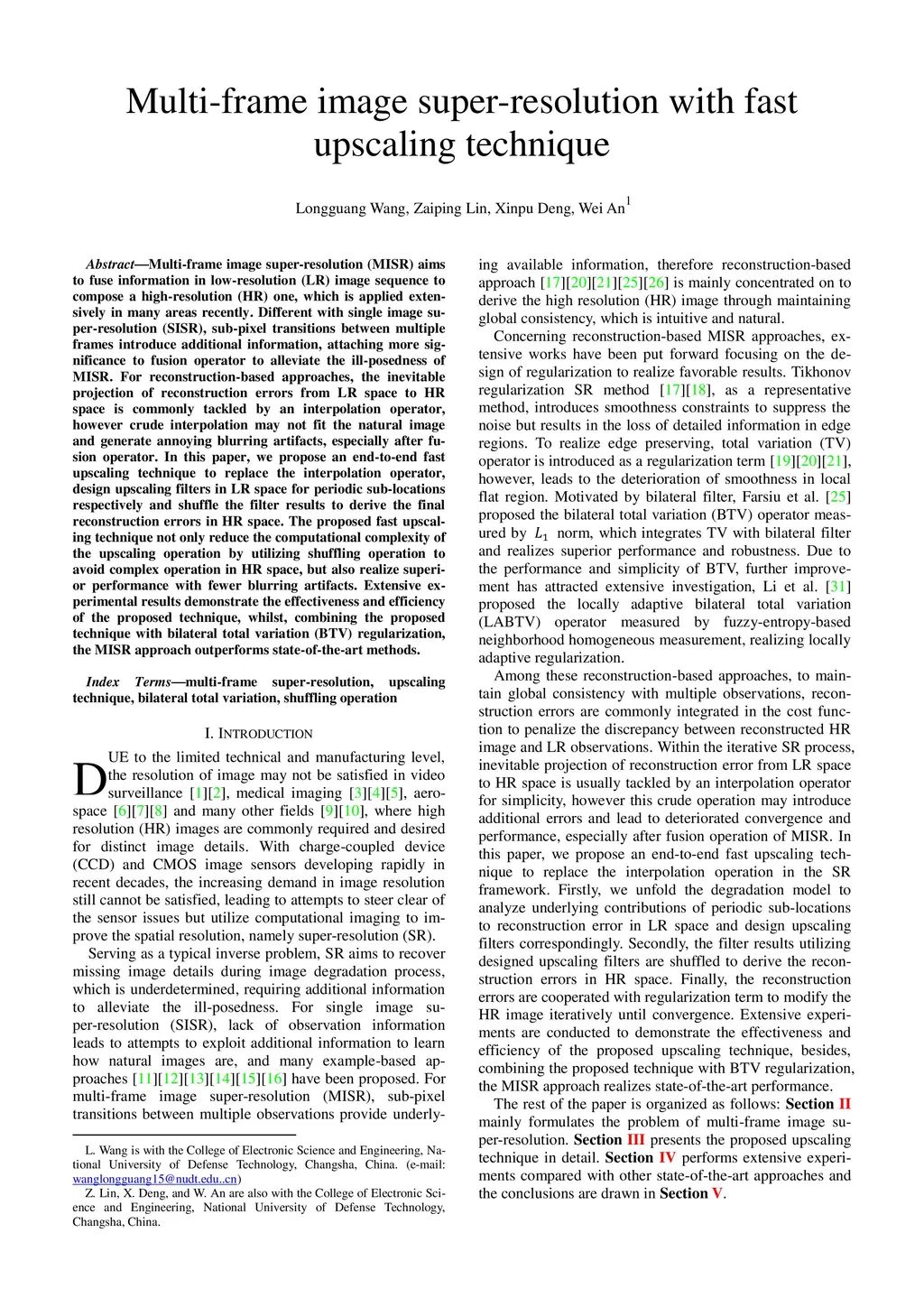 Multi-frame image super-resolution (MISR) aims to fuse information in low-resolution (LR) image sequence to compose a high-resolution (HR) one, which is applied extensively in many areas recently. Different with single image super-resolution (SISR), sub-pixel transitions between multiple frames introduce additional information, attaching more significance to fusion operator to alleviate the ill-posedness of MISR. For reconstruction-based approaches, the inevitable projection of reconstruction errors from LR space to HR space is commonly tackled by an interpolation operator, however crude interpolation may not fit the natural image and generate annoying blurring artifacts, especially after fusion operator. In this paper, we propose an end-to-end fast upscaling technique to replace the interpolation operator, design upscaling filters in LR space for periodic sub-locations respectively and shuffle the filter results to derive the final reconstruction errors in HR space. The proposed fast upscaling technique not only reduce the computational complexity of the upscaling operation by utilizing shuffling operation to avoid complex operation in HR space, but also realize superior performance with fewer blurring artifacts. Extensive experimental results demonstrate the effectiveness and efficiency of the proposed technique, whilst, combining the proposed technique with bilateral total variation (BTV) regu-larization, the MISR approach outperforms state-of-the-art methods.
