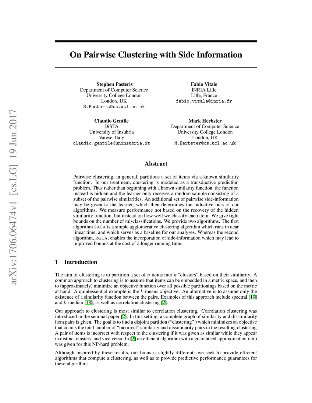 Pairwise clustering, in general, partitions a set of items via a known similarity function. In our treatment, clustering is modeled as a transductive prediction problem. Thus rather than beginning with a known similarity function, the function instead is hidden and the learner only receives a random sample consisting of a subset of the pairwise similarities. An additional set of pairwise side-information may be given to the learner, which then determines the inductive bias of our algorithms. We measure performance not based on the recovery of the hidden similarity function, but instead on how well we classify each item. We give tight bounds on the number of misclassifications. We provide two algorithms. The first algorithm SACA is a simple agglomerative clustering algorithm which runs in near linear time, and which serves as a baseline for our analyses. Whereas the second algorithm, RGCA, enables the incorporation of side-information which may lead to improved bounds at the cost of a longer running time.