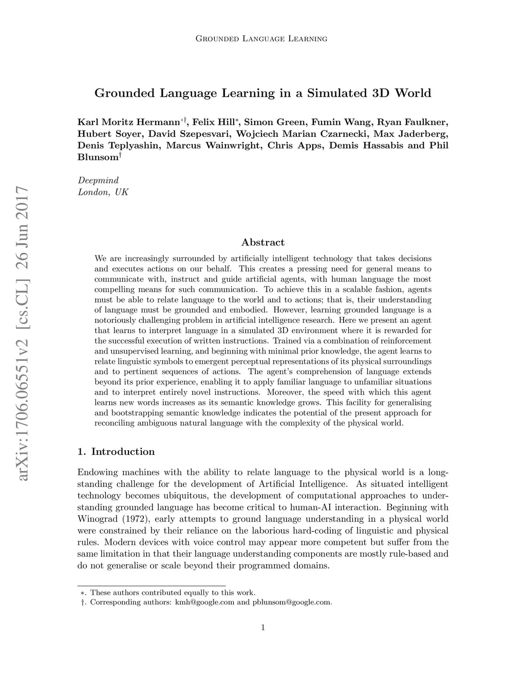 We are increasingly surrounded by artificially intelligent technology that takes decisions and executes actions on our behalf. This creates a pressing need for general means to communicate with, instruct and guide artificial agents, with human language the most compelling means for such communication. To achieve this in a scalable fashion, agents must be able to relate language to the world and to actions; that is, their understanding of language must be grounded and embodied. However, learning grounded language is a notoriously challenging problem in artificial intelligence research. Here we present an agent that learns to interpret language in a simulated 3D environment where it is rewarded for the successful execution of written instructions. Trained via a combination of reinforcement and unsupervised learning, and beginning with minimal prior knowledge, the agent learns to relate linguistic symbols to emergent perceptual representations of its physical surroundings and to pertinent sequences of actions. The agent's comprehension of language extends beyond its prior experience, enabling it to apply familiar language to unfamiliar situations and to interpret entirely novel instructions. Moreover, the speed with which this agent learns new words increases as its semantic knowledge grows. This facility for generalising and bootstrapping semantic knowledge indicates the potential of the present approach for reconciling ambiguous natural language with the complexity of the physical world.