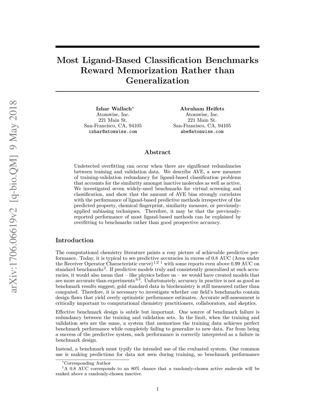 Undetected overfitting can occur when there are significant redundancies between training and validation data. We describe AVE, a new measure of training-validation redundancy for ligand-based classification problems that accounts for the similarity amongst inactive molecules as well as active. We investigated nine widely-used benchmarks for virtual screening and QSAR, and show that the amount of AVE bias strongly correlates with the performance of ligand-based predictive methods irrespective of the predicted property, chemical fingerprint, similarity measure, or previously-applied unbiasing techniques. Therefore, it is likely that the previously-reported performance of most ligand-based methods can be explained by overfitting to benchmarks rather than good prospective accuracy.