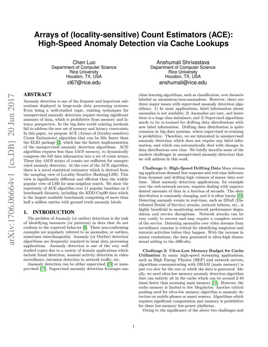 Anomaly detection is one of the frequent and important subroutines deployed in large-scale data processing systems. Even being a well-studied topic, existing techniques for unsupervised anomaly detection require storing significant amounts of data, which is prohibitive from memory and latency perspective. In the big-data world existing methods fail to address the new set of memory and latency constraints. In this paper, we propose ACE (Arrays of (locality-sensitive) Count Estimators) algorithm that can be 60x faster than the ELKI package~\cite{DBLP:conf/ssd/AchtertBKSZ09}, which has the fastest implementation of the unsupervised anomaly detection algorithms. ACE algorithm requires less than memory, to dynamically compress the full data information into a set of count arrays. These tiny arrays of counts are sufficient for unsupervised anomaly detection. At the core of the ACE algorithm, there is a novel statistical estimator which is derived from the sampling view of Locality Sensitive Hashing(LSH). This view is significantly different and efficient than the widely popular view of LSH for near-neighbor search. We show the superiority of ACE algorithm over 11 popular baselines on 3 benchmark datasets, including the KDD-Cup99 data which is the largest available benchmark comprising of more than half a million entries with ground truth anomaly labels.
