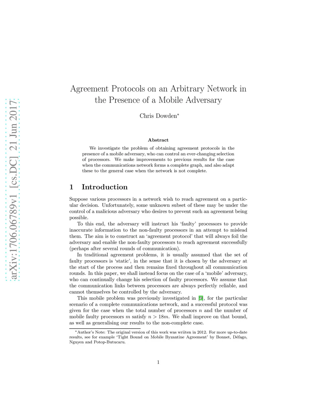 We investigate the problem of obtaining agreement protocols in the presence of a mobile adversary, who can control an ever-changing selection of processors. We make improvements to previous results for the case when the communications network forms a complete graph, and also adapt these to the general case when the network is not complete.