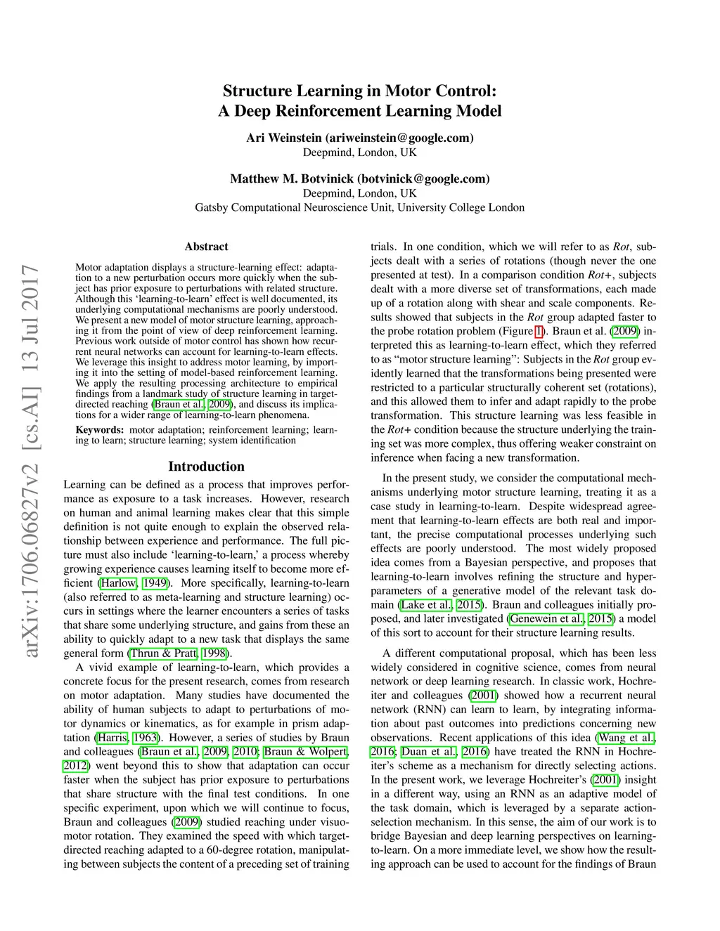 Motor adaptation displays a structure-learning effect: adaptation to a new perturbation occurs more quickly when the subject has prior exposure to perturbations with related structure. Although this `learning-to-learn' effect is well documented, its underlying computational mechanisms are poorly understood. We present a new model of motor structure learning, approaching it from the point of view of deep reinforcement learning. Previous work outside of motor control has shown how recurrent neural networks can account for learning-to-learn effects. We leverage this insight to address motor learning, by importing it into the setting of model-based reinforcement learning. We apply the resulting processing architecture to empirical findings from a landmark study of structure learning in target-directed reaching (Braun et al., 2009), and discuss its implications for a wider range of learning-to-learn phenomena.